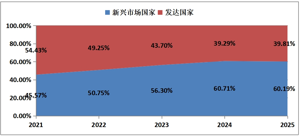 五是营业收入占比上,2025年500强企业中,新兴市场国家企业的总营业收入占比为60.19%(见图5),比上年的60.71%小幅减少0.52个百分点;发达国家的占比则为39.81%,比上年的39.29%小幅增加0.52个百分点。