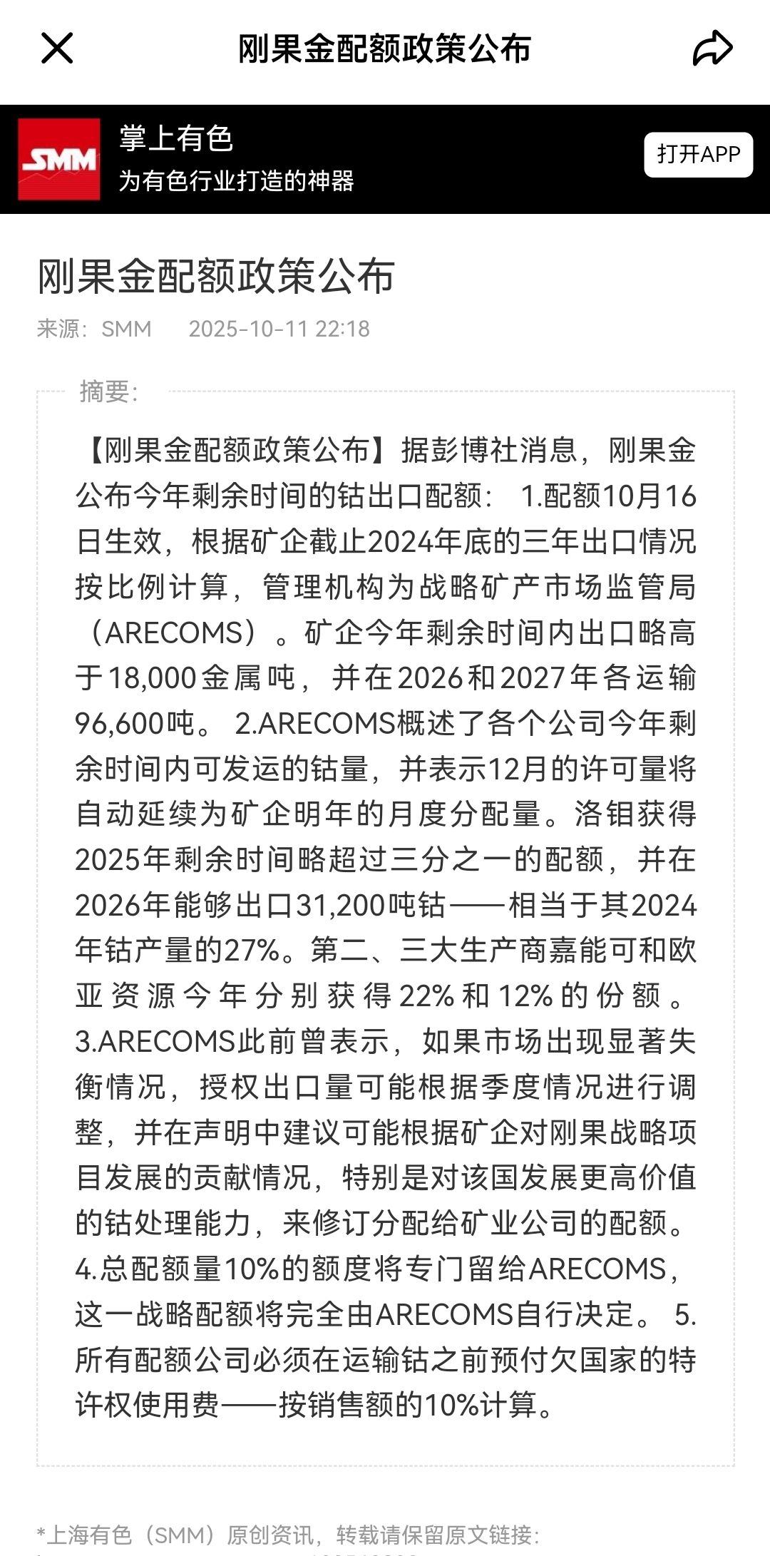 1.配额10月16日生效,根据矿企截止2024年底的三年出口情况按比例计算,管理机构为战略矿产市场监管局(ARECOMS)。矿企今年剩余时间内出口略高于18,000金属吨,并在2026和2027年各运输96,600吨。