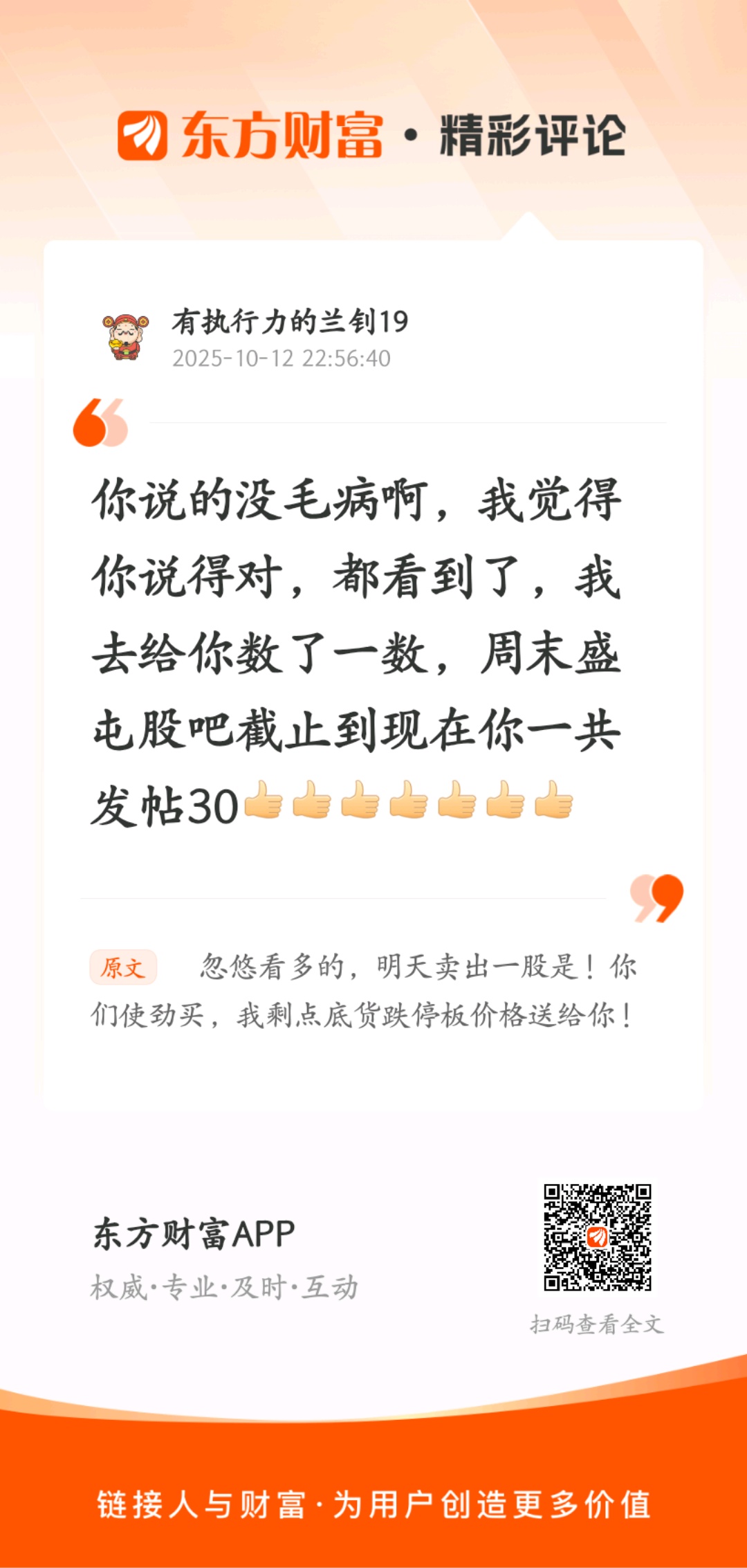 温馨提示: 1.根据《证券法》规定,禁止编造、传播虚假信息或者误导性信息,扰乱证券市场;2.用户在本社区发表的所有资料、言论等仅代表个人观点,与本网站立场无关,不对您构成任何投资建议。用户应基于自己的独立判断,自行决定证券投资并承担相应风险。《东方财富社区管理规定》