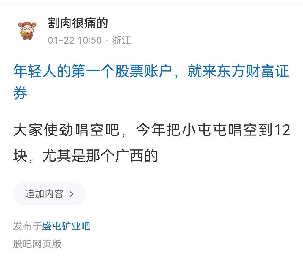 温馨提示: 1.根据《证券法》规定,禁止编造、传播虚假信息或者误导性信息,扰乱证券市场;2.用户在本社区发表的所有资料、言论等仅代表个人观点,与本网站立场无关,不对您构成任何投资建议。用户应基于自己的独立判断,自行决定证券投资并承担相应风险。《东方财富社区管理规定》