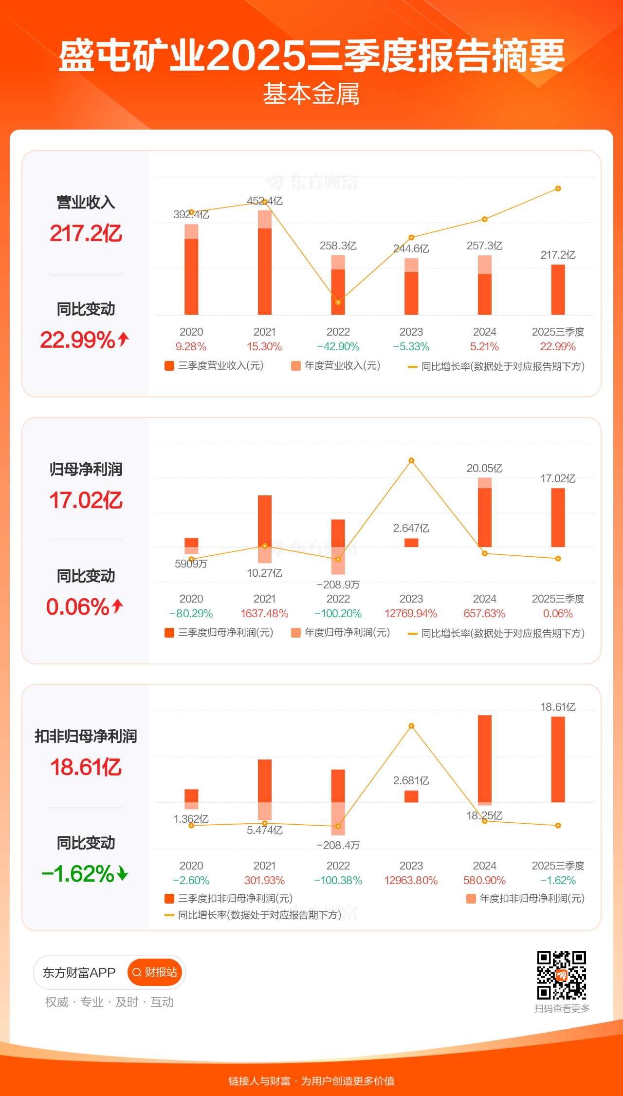 盛屯矿业10月24日发布2025年三季报显示,公司前三季实现营业收入217.17亿元,同比增长22.99%;归母净利润17.02亿元,同比增长0.06%;扣非归母净利润18.61亿元,同比下滑1.62%。
