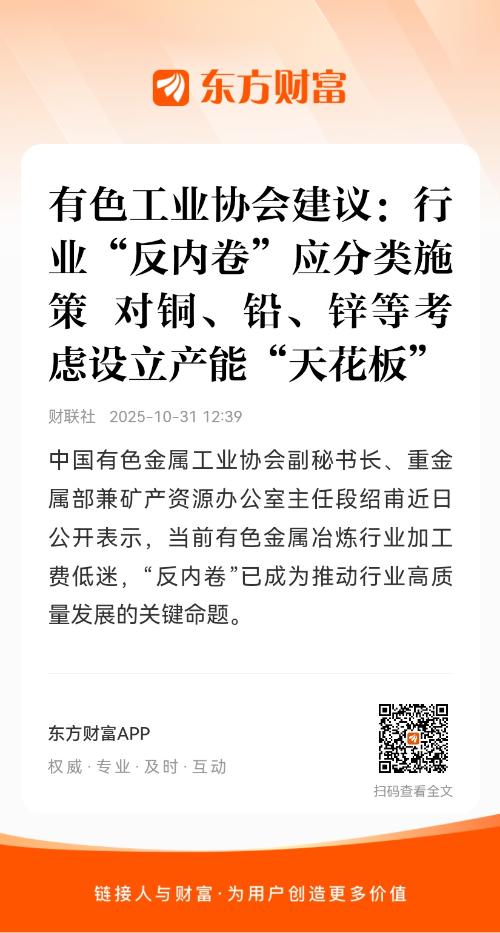 中国有色金属工业协会副秘书长、重金属部兼矿产资源办公室主任段绍甫近日公开表示,当前有色金属冶炼行业加工费低迷,“反内卷”已成为推动行业高质量发展的关键命题。对于行业“反内卷”实施路径,协会建议分类施策:一是借鉴电解铝经验,对铜、铅、锌等大宗金属考虑设立产能“天花板”,严控新增产能;二是对战略金属通过兼并重组提升集中度,增强产业链控制能力;三是在保持深加工产业充分竞争的同时,引导企业向个性化、高附加值方向转型,避免同质化竞争。