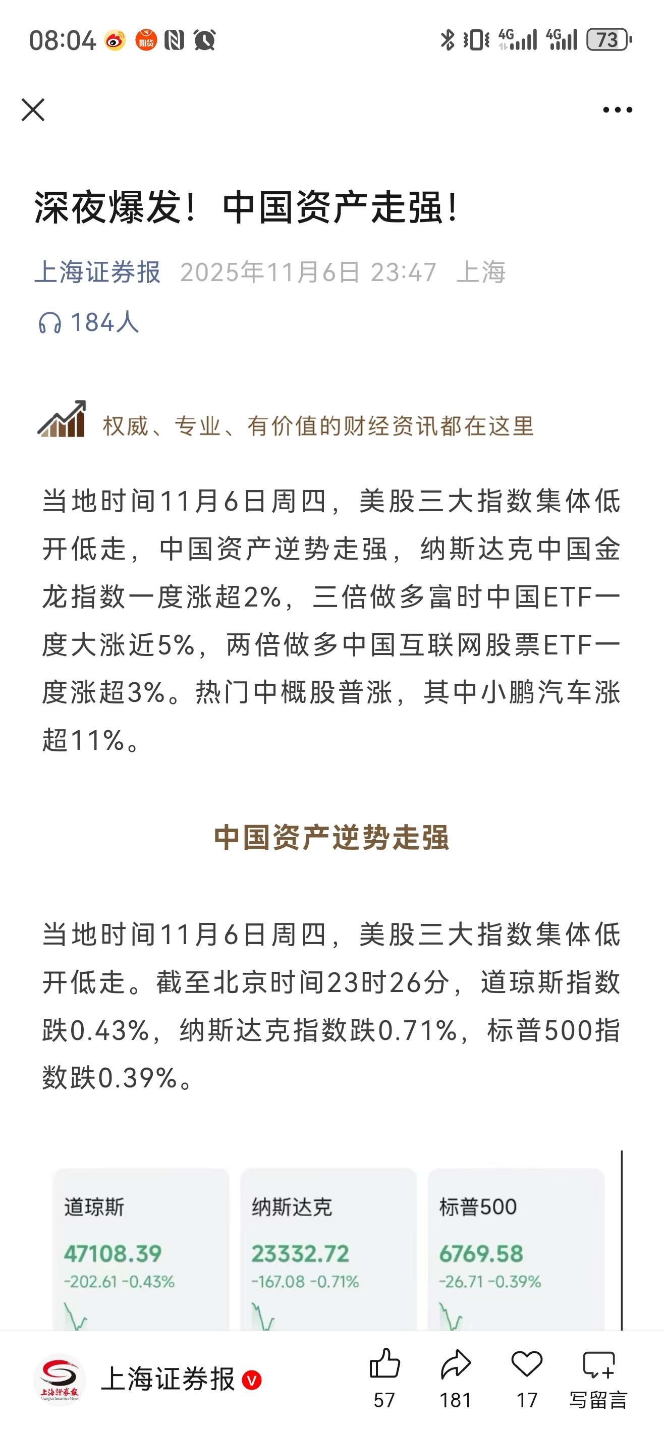 $盛屯矿业(SH600711)$ 当地时间11月6日周四,美股三大指数集体低开低走,中国资产逆势走强,纳斯达克中国金龙指数一度涨超2%,三倍做多富时中国ETF一度大涨近5%,两倍做多中国互联网股票ETF一度涨超3%。热门中概股普涨,其中小鹏汽车涨超11%。