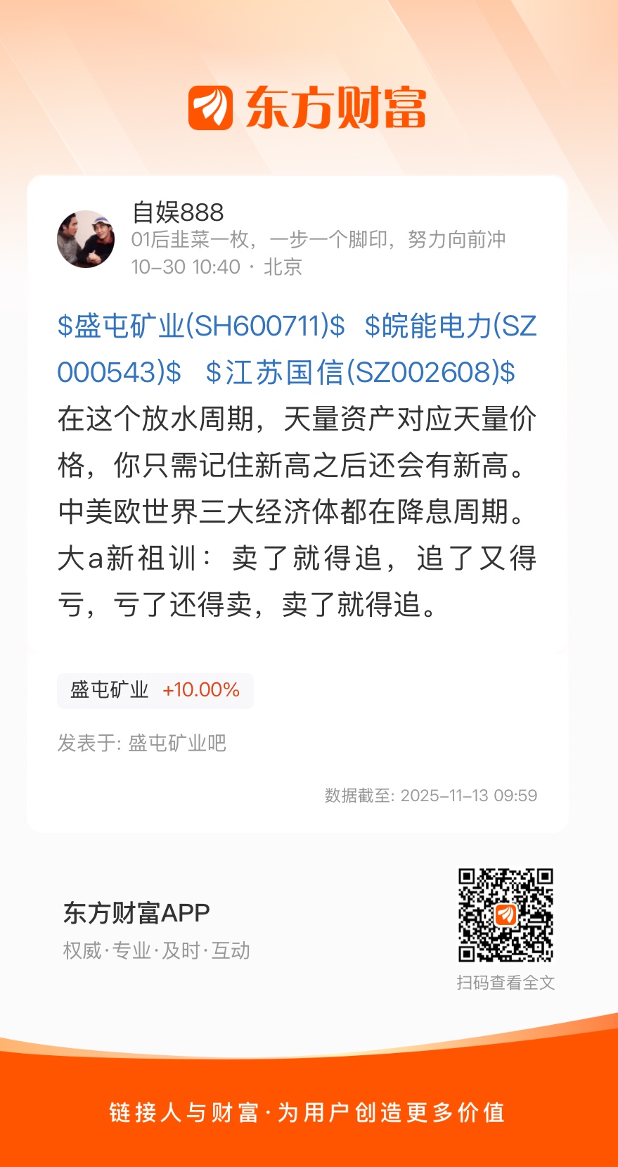 $盛屯矿业(SH600711)$ $皖能电力(SZ000543)$ $江苏国信(SZ002608)$ 在这个放水周期,天量资产对应天量价格,你只需记住新高之后还会有新高。中美欧世界三大经济体都在降息周期。大a新祖训:卖了就得追,追了又得亏,亏了还得卖,卖了就得追。
