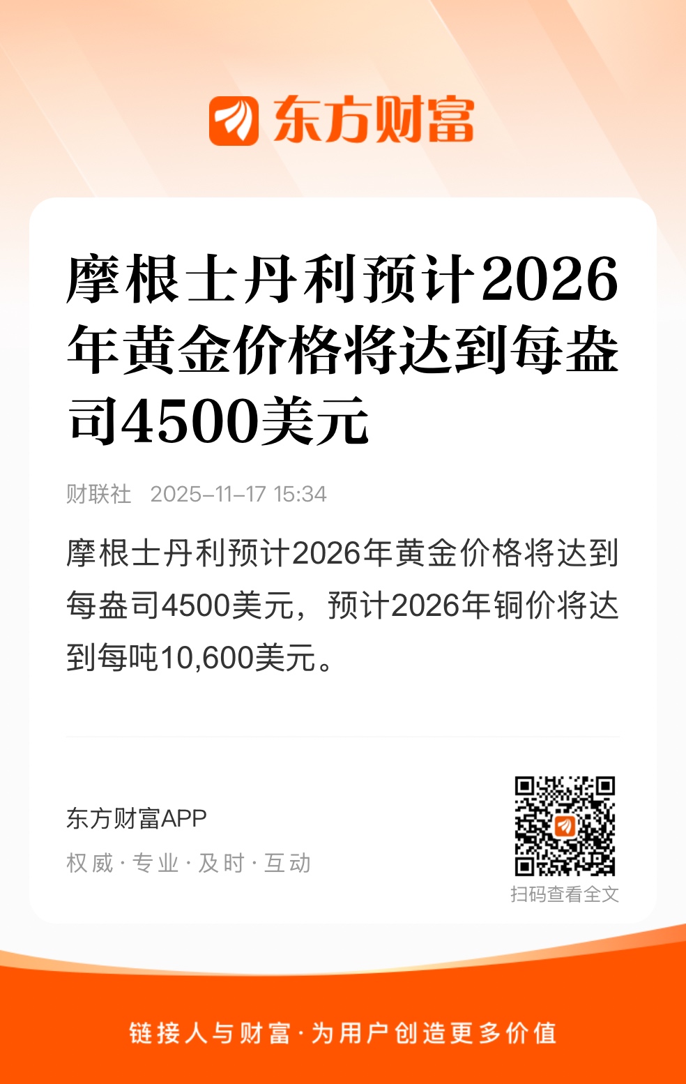 摩根士丹利预计2026年黄金价格将达到每盎司4500美元,预计2026年铜价将达到每吨10,600美元。