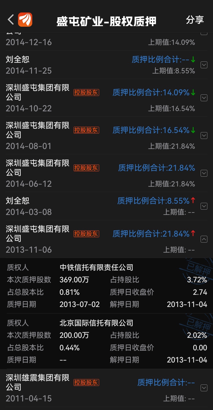 $盛屯矿业(SH600711)$ 刚才看了一下公告,这笔质押是2013.11.4,12年前的事,这质押的钱用了12年,茶水费总是有的