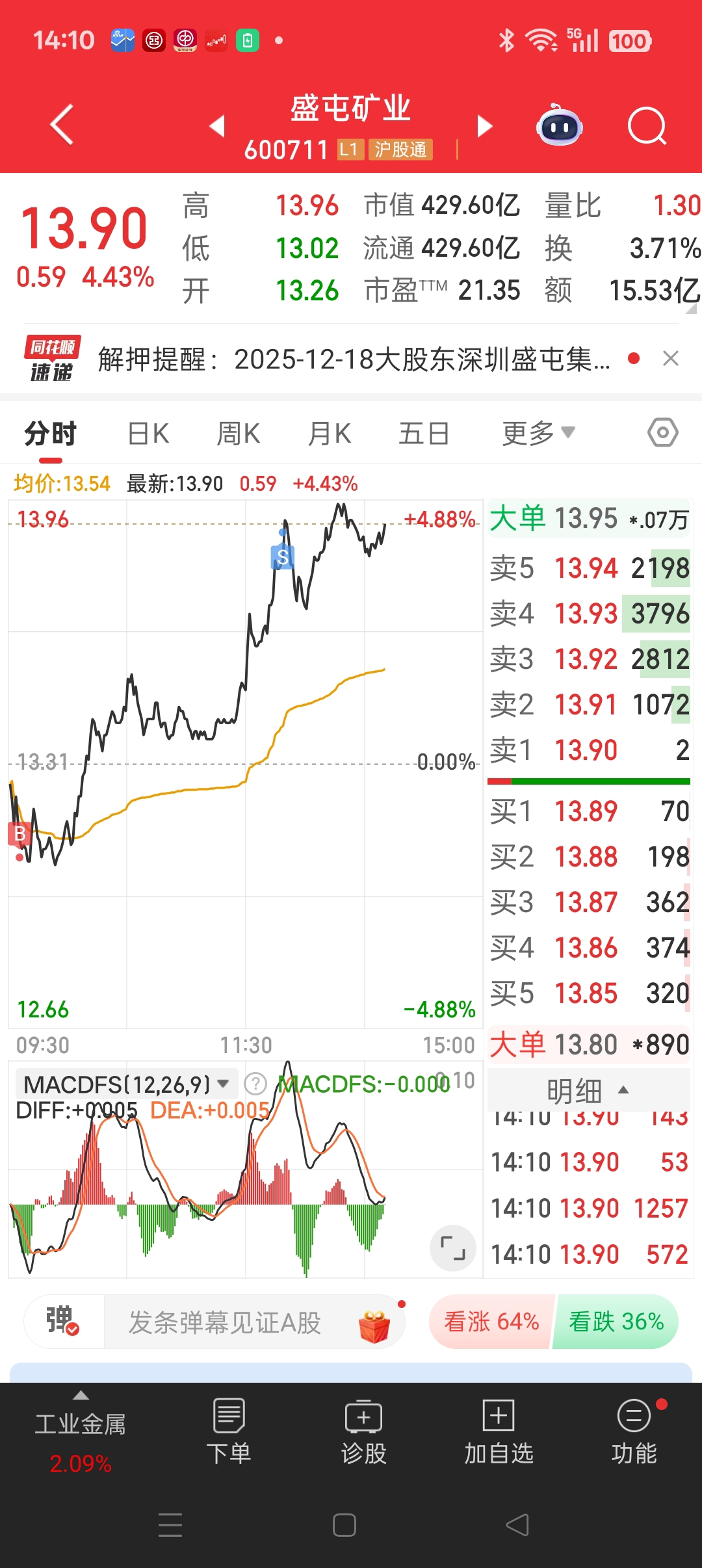 有幸,上周五$盛屯矿业(SH600711)$ 又是完成了海底捞月,加仓,止盈,完成了一日盘中置换了五个点的筹码。