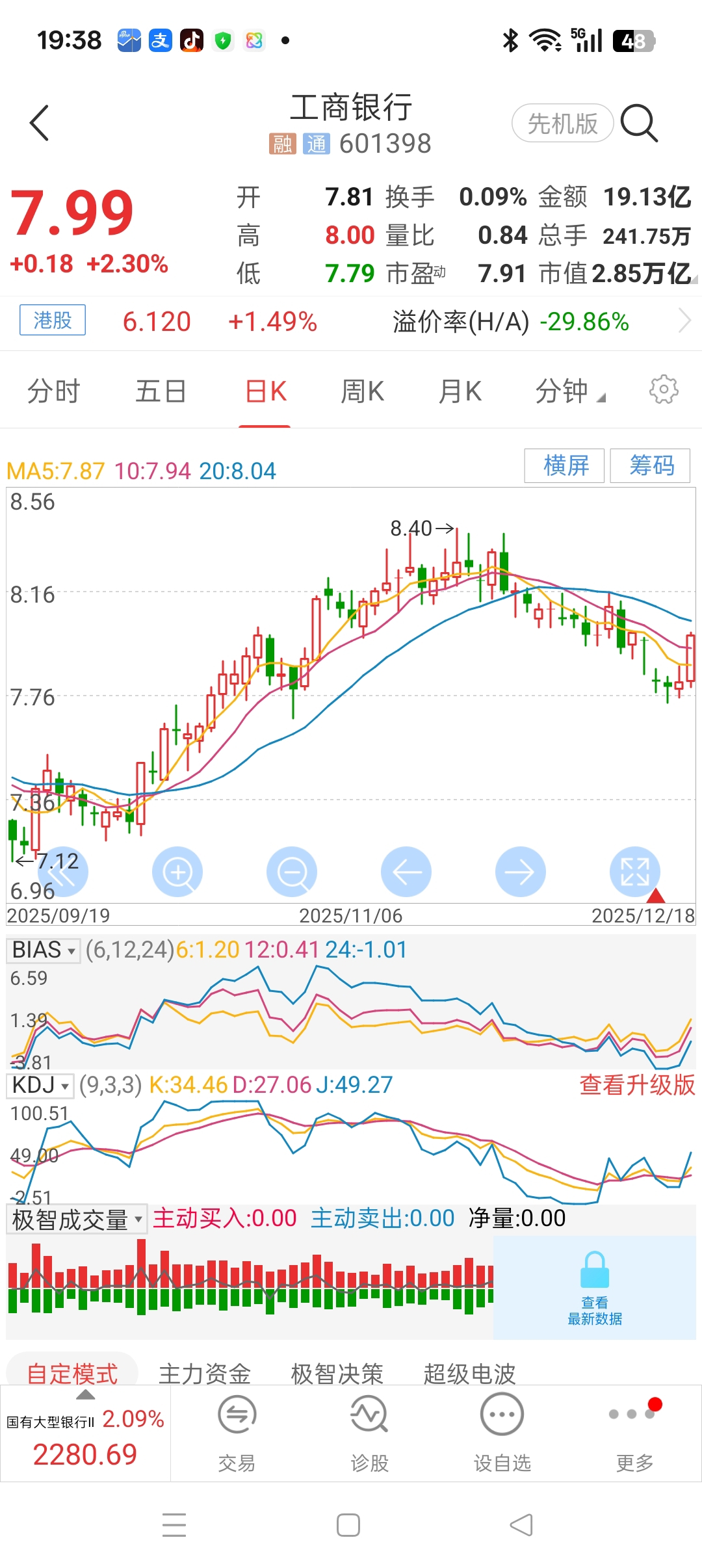 资金所限,不能实盘操作$工商银行(SH601398)$ 。只能用虚拟盘验证:分红前,7.85加仓一万股,分红0.14元后,在上周四7.92止盈。其实,也是错过当然最高位。