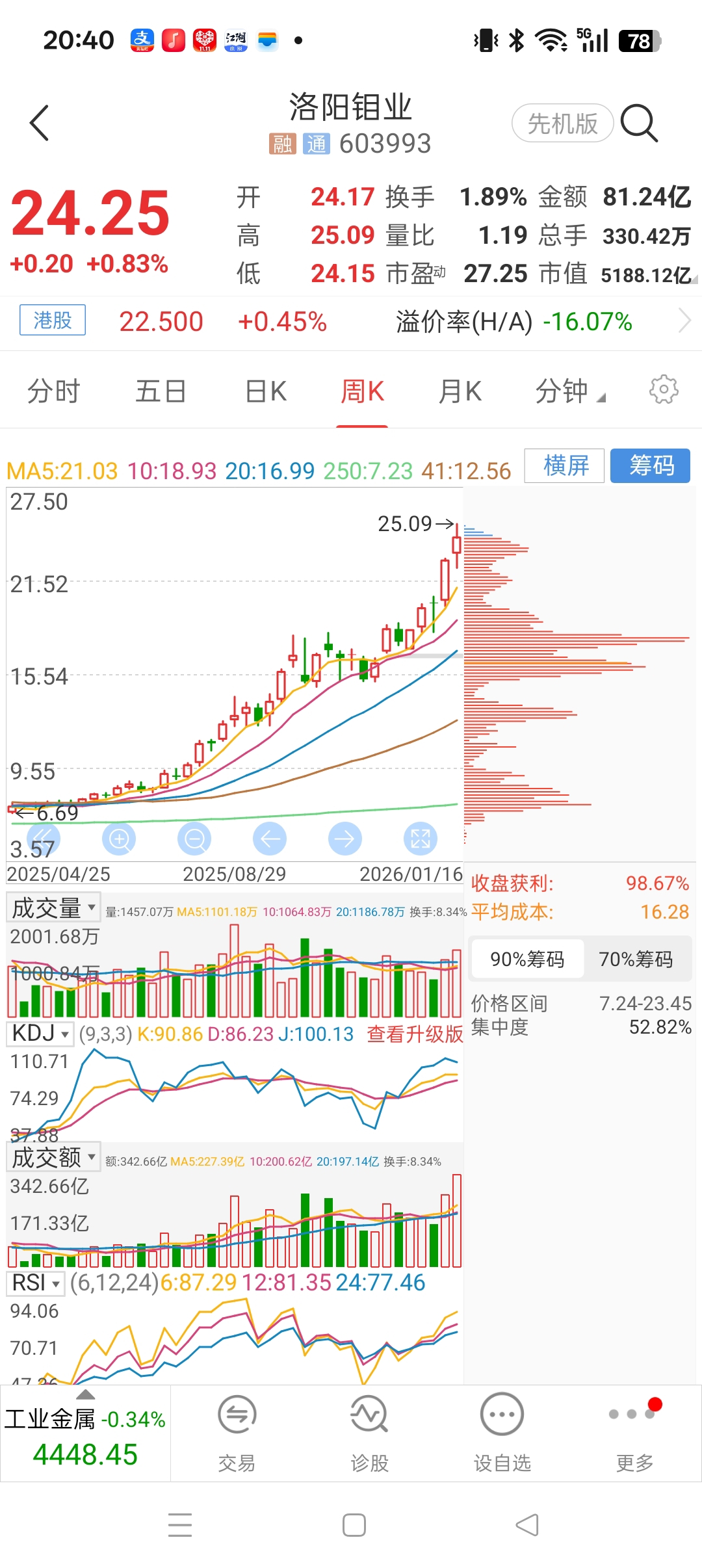 盛屯矿业与洛阳钼业的K线图很是丝滑,皆是呈现多头发散状态。不过上周五还是降低了仓位,毕竟保住本金的安全比大幅获利更重要。
