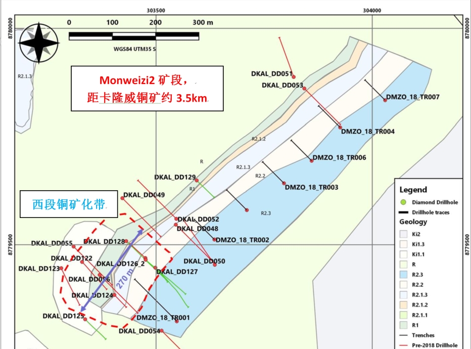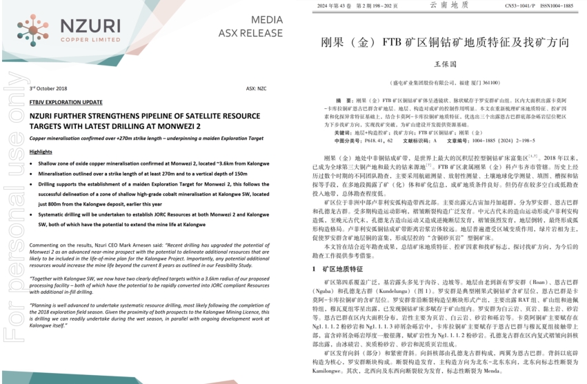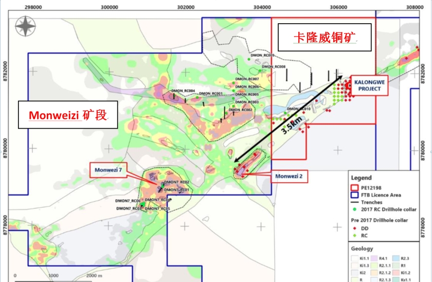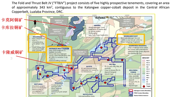 地质条件优越:覆盖卢菲利弧富矿带,航磁与土壤化学检测圈定46处铜异常、33处钴异常,矿化集中于断裂构造带(如Monweizi、Kasangasi等靶区)。