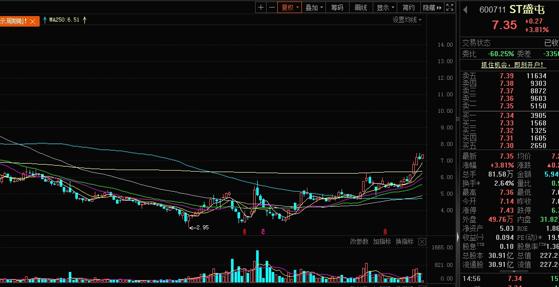 各位战友,大家好!承接上贴,猫哥说过摘帽前连跌一周才健康,上周一后相当于调整了四天,预期之内哈!之前也说过调整的幅度不是很大,猫哥预演过应该在6.75左右较为合理!所以打野的资金一直不敢乱动就等着他到这个位置,预期是周一低开然后打野资金梭哈,失算了哈。