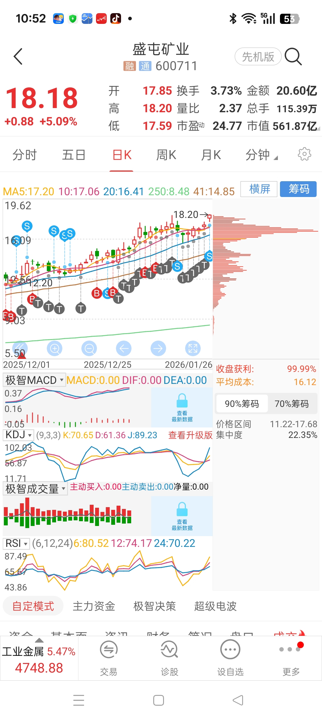 见$盛屯矿业(SH600711)$ 主力做多意愿不是太强,只能忍痛割爱了,高位止盈。还行,近收盘给了机会,又高位接回。