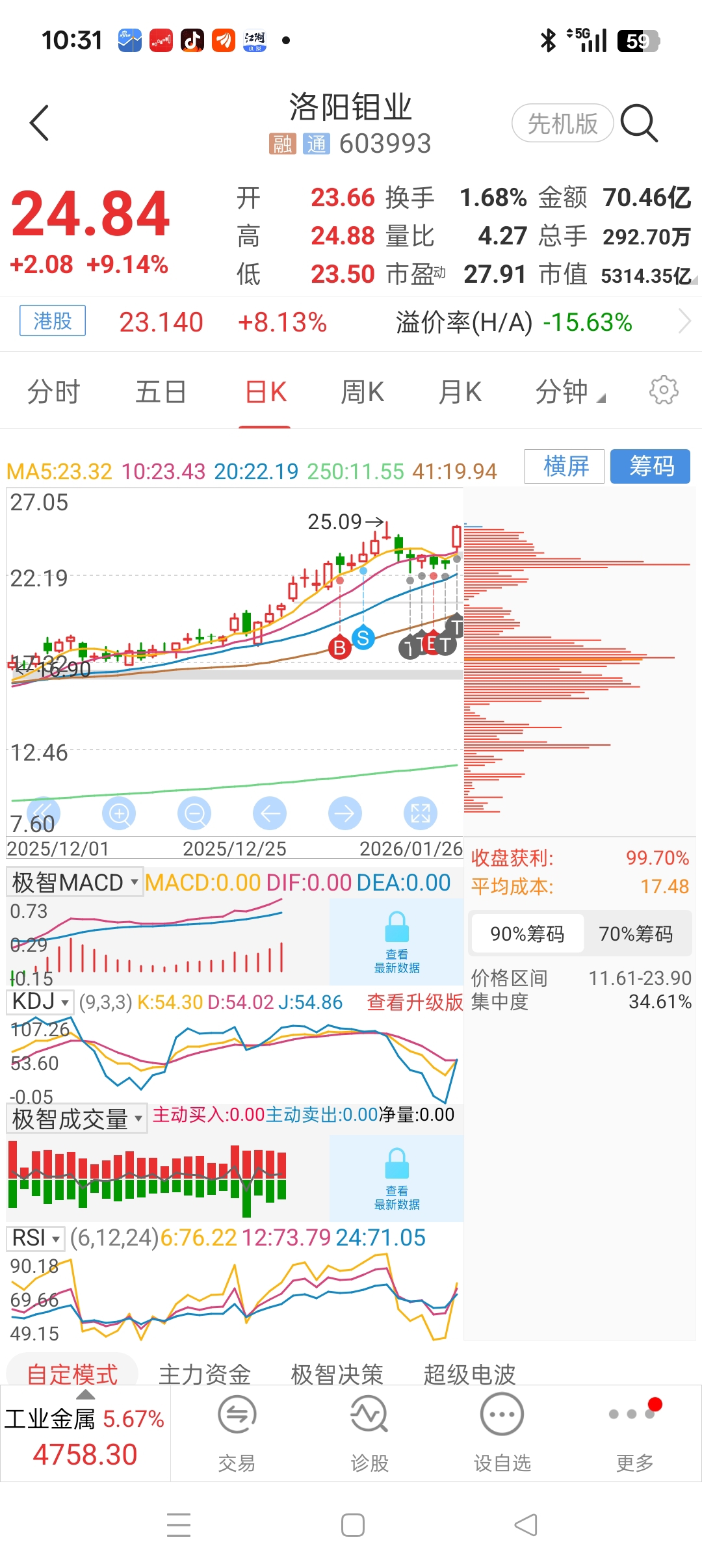 只是$洛阳钼业(SH603993)$ 操作的不是太理想。获利五个多点踢飞了,没有机会再接回。静观吧……