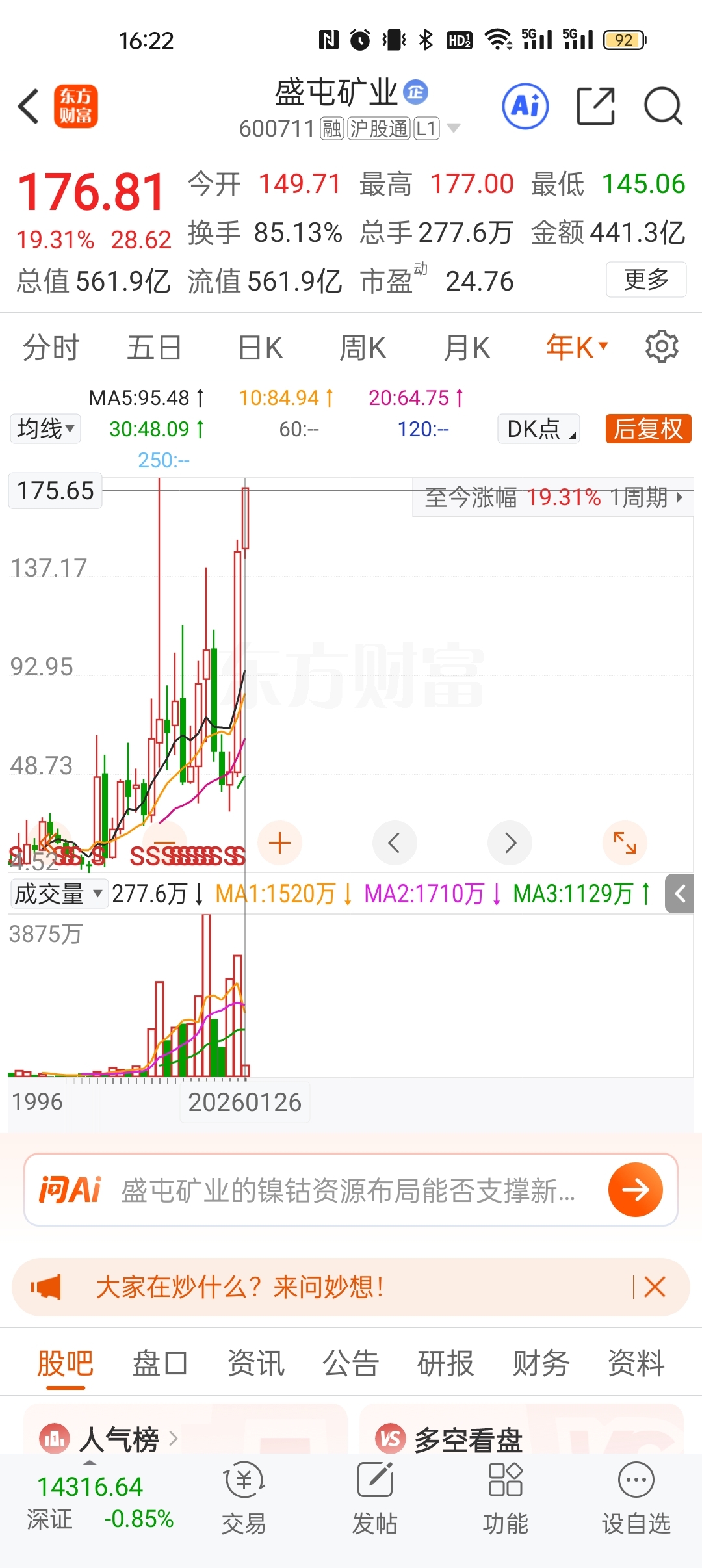 $盛屯矿业(SH600711)$ 哈哈哈,笑不活了,刚刚看见一个帖子说盛屯历史最高价是31.33,还费老劲的写了几百字的帖子,还一本正经的拉一个不复权价格来说事,我想说你咋不把设置调成后复权价格呢,后复权价格目前价格176.81