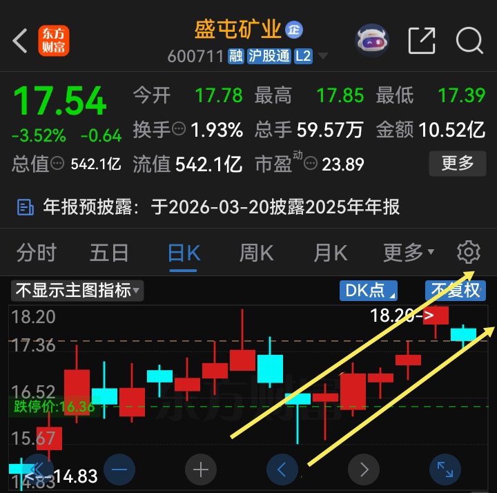 $盛屯矿业(SH600711)$ 实时解盘, 2026.1.27第一个小时,看图,盛屯这次是走新的上升通道,技术面分析,k战系统没有破坏,下方支撑位17.12,上方压力位18.15,今天回补缺口,上方抛压重,主要是基本面影响,只要不破位可继续观望
