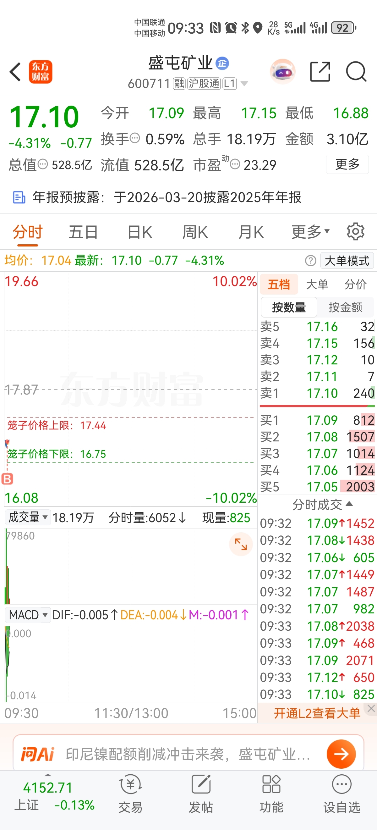 $盛屯矿业(SH600711)$ 没买到最低价手慢了,唉
