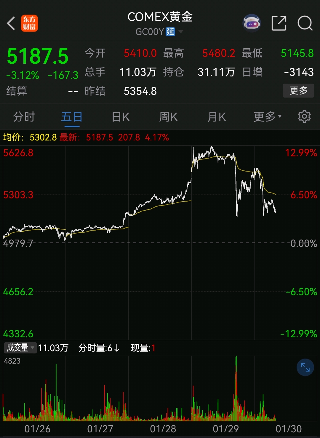 确实,今天收盘时,金价确实比前天的位置,还低一点,这能说得过去,比前天低,再加上情绪恐慌,可以有溢价杀跌的成份。