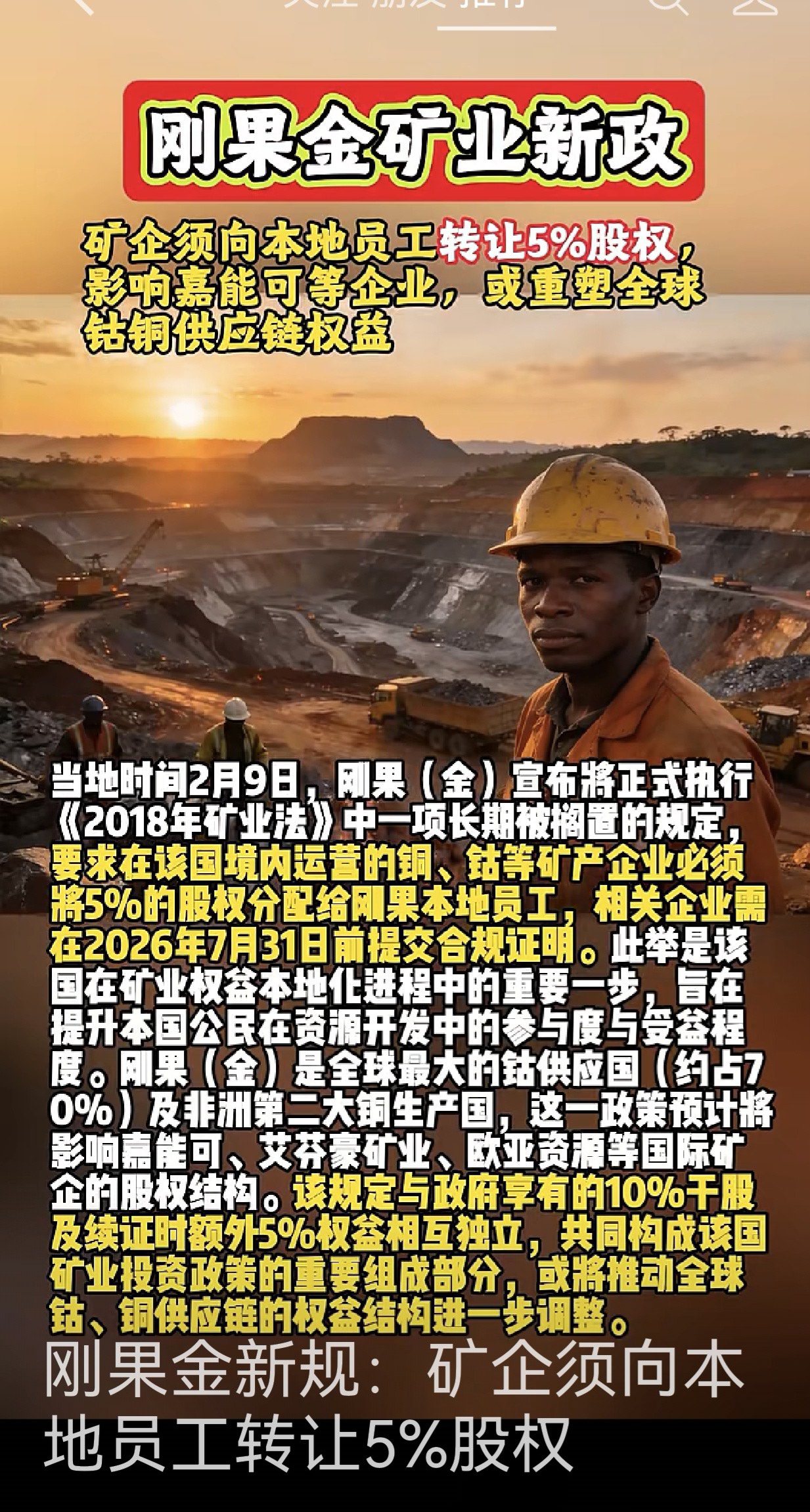 刚果铜钴矿企必须对当地职员出让5%的股权