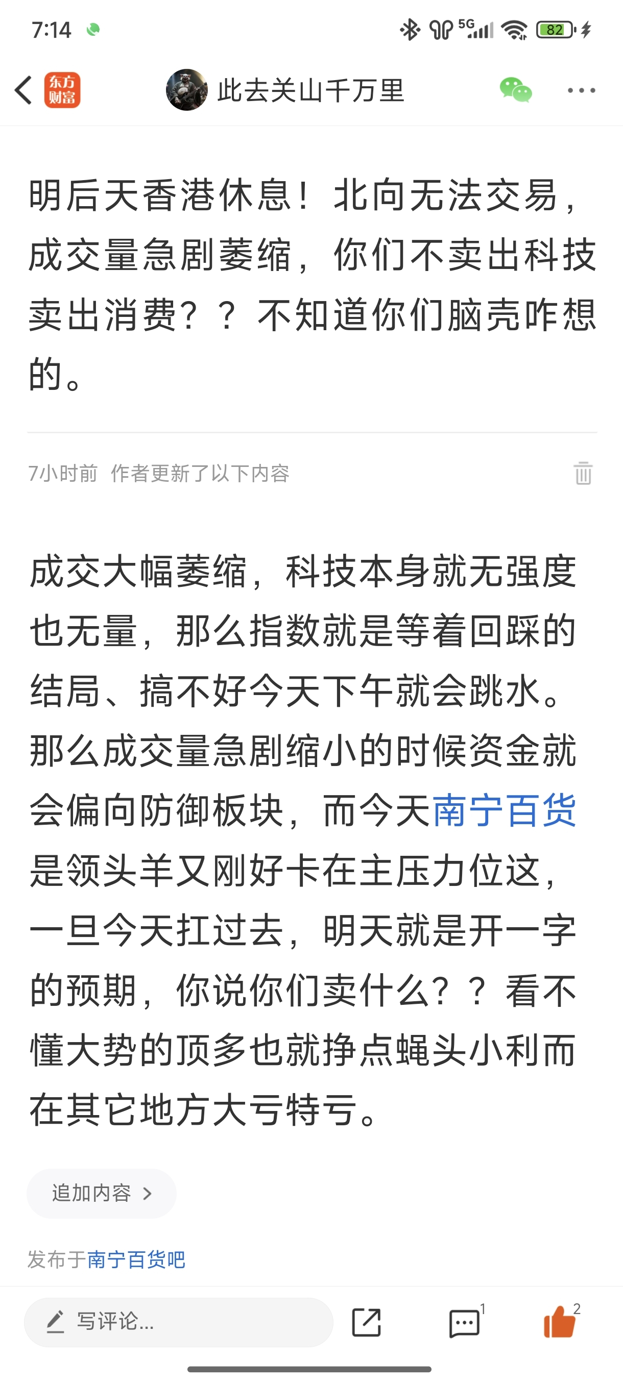 南宁百货明天要开一字了,北向休息成交量急剧缩小,那么明天科技无法压制消费,作为今