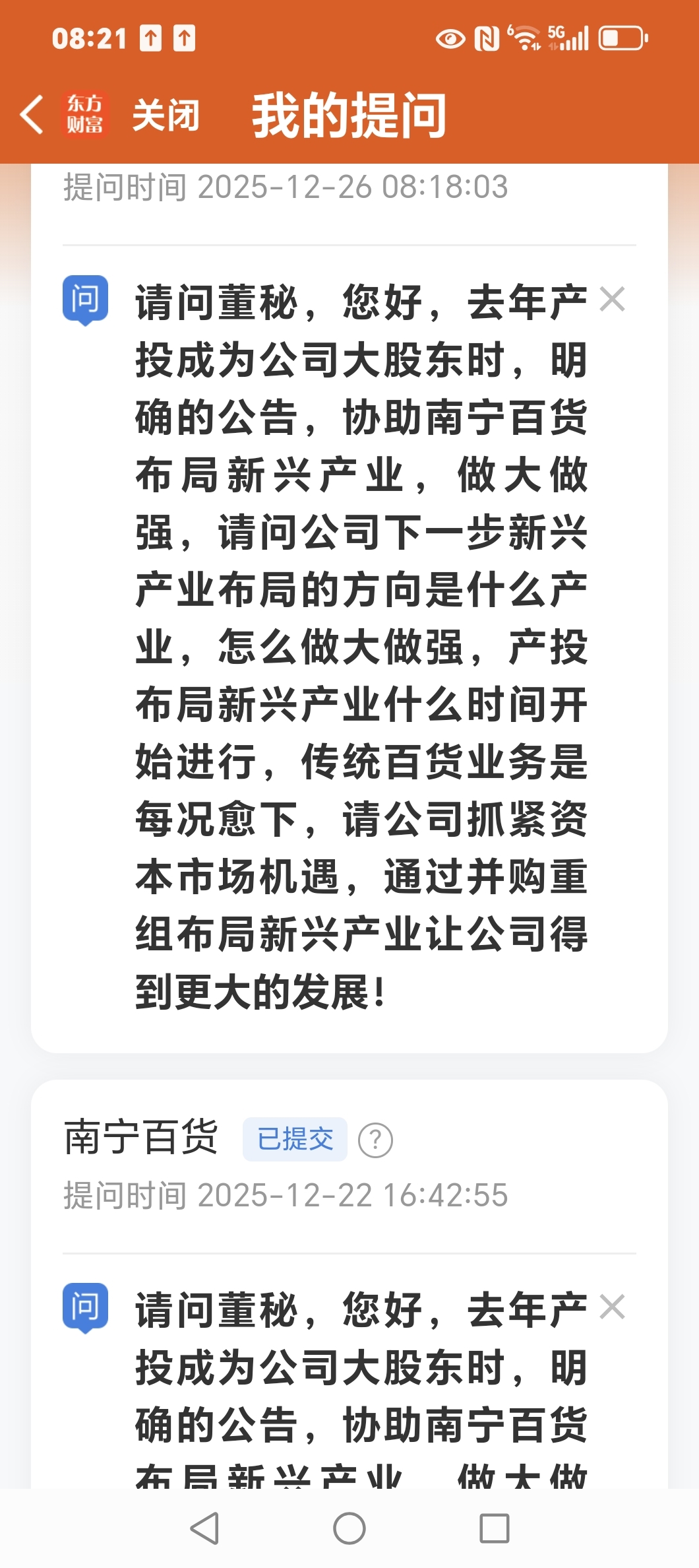 $南宁百货(SH600712)$ 我坚持每天都向公司问产投协助公司布局新兴产业做大做强的这个问题!希望能有回复,尊重投资者的问题并答复是上市公司上市最基本的常识与水平的表现!