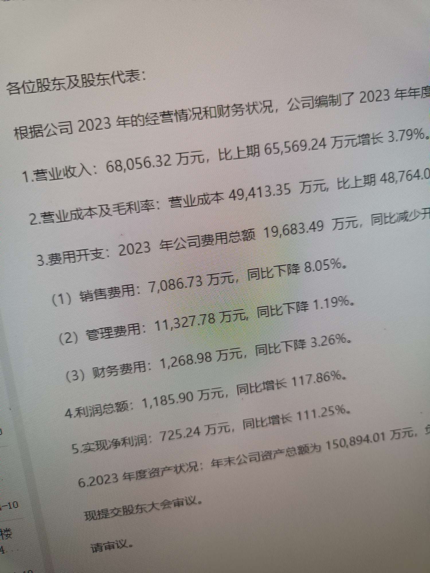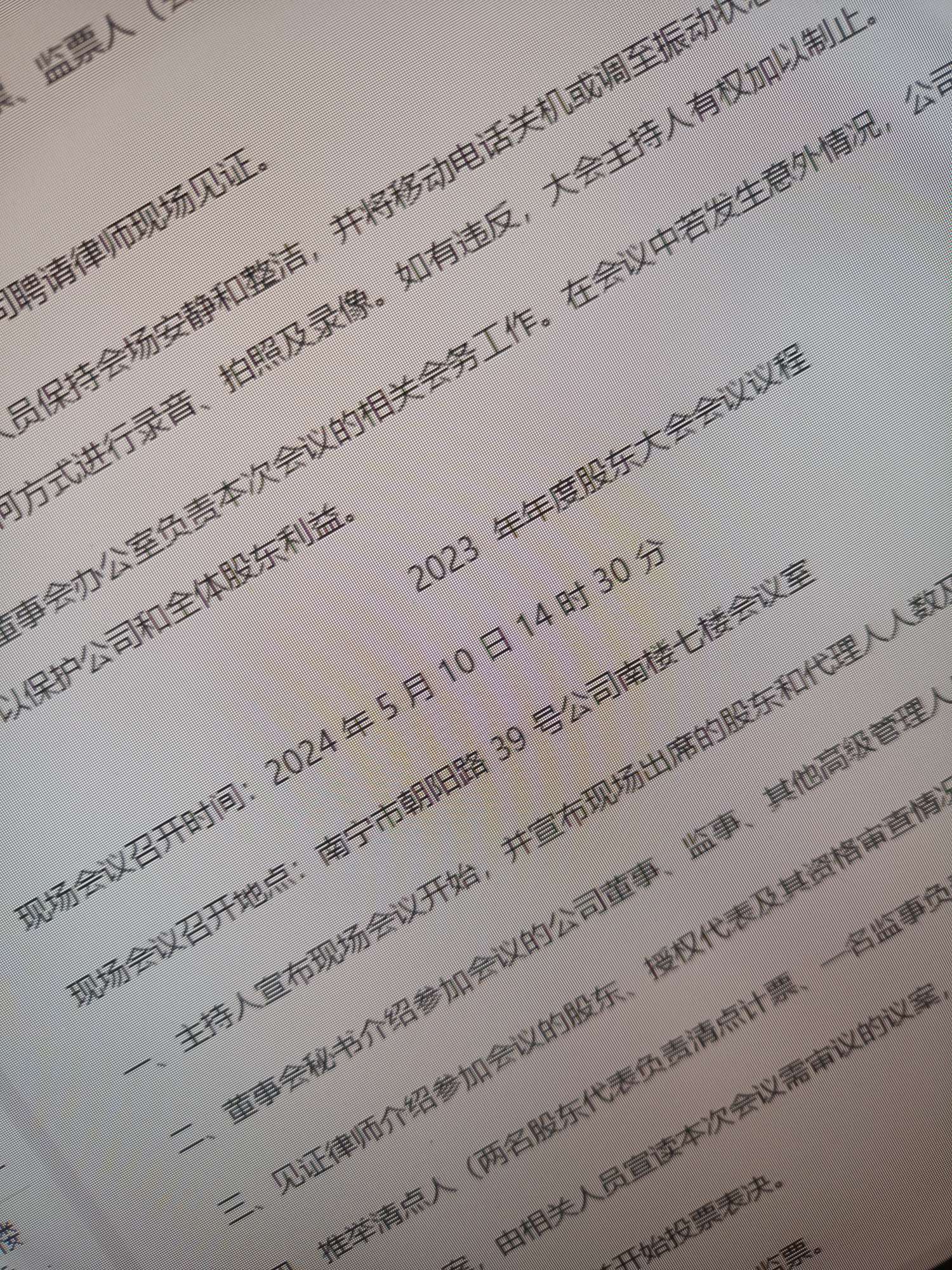 $南宁百货(SH600712)$ 今天的股东大会开得非常好,没有公告,也没有人知道,连南宁百货公司客服都不知道,打了多少个电话,都没有人接听。不知审议的到底是个啥?保密工作做得非常到位。审议的报告有这样的几条,第一2023年度,财务费用全部降下来了,利润增长了很多。但是可供分配的利润不多,所以不分配了。