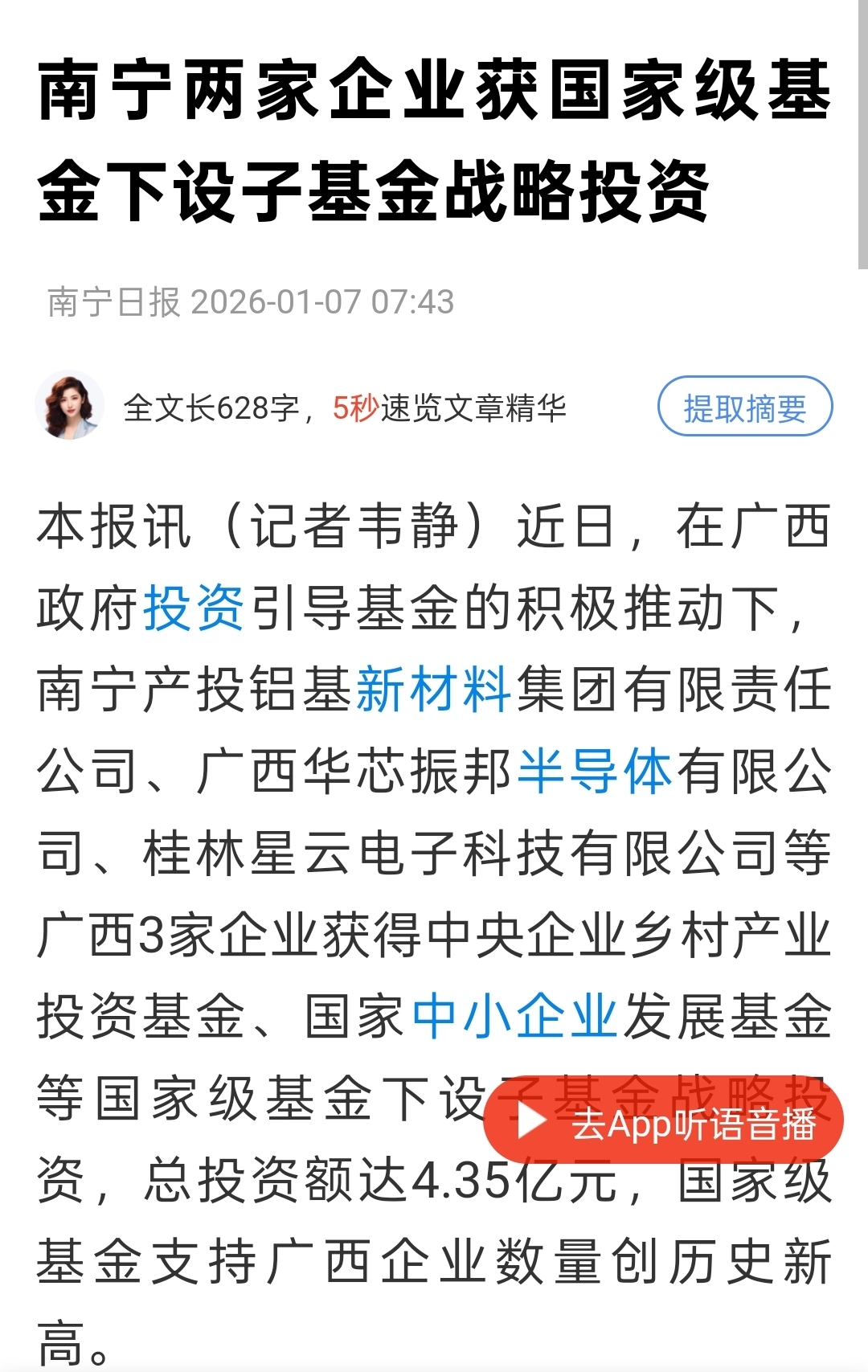 $南宁百货(SH600712)$ 南宁产投旗下铝基新材料和华芯振邦半导体获得国家大基金战投入股,哪个注入南宁都是一飞冲天。
