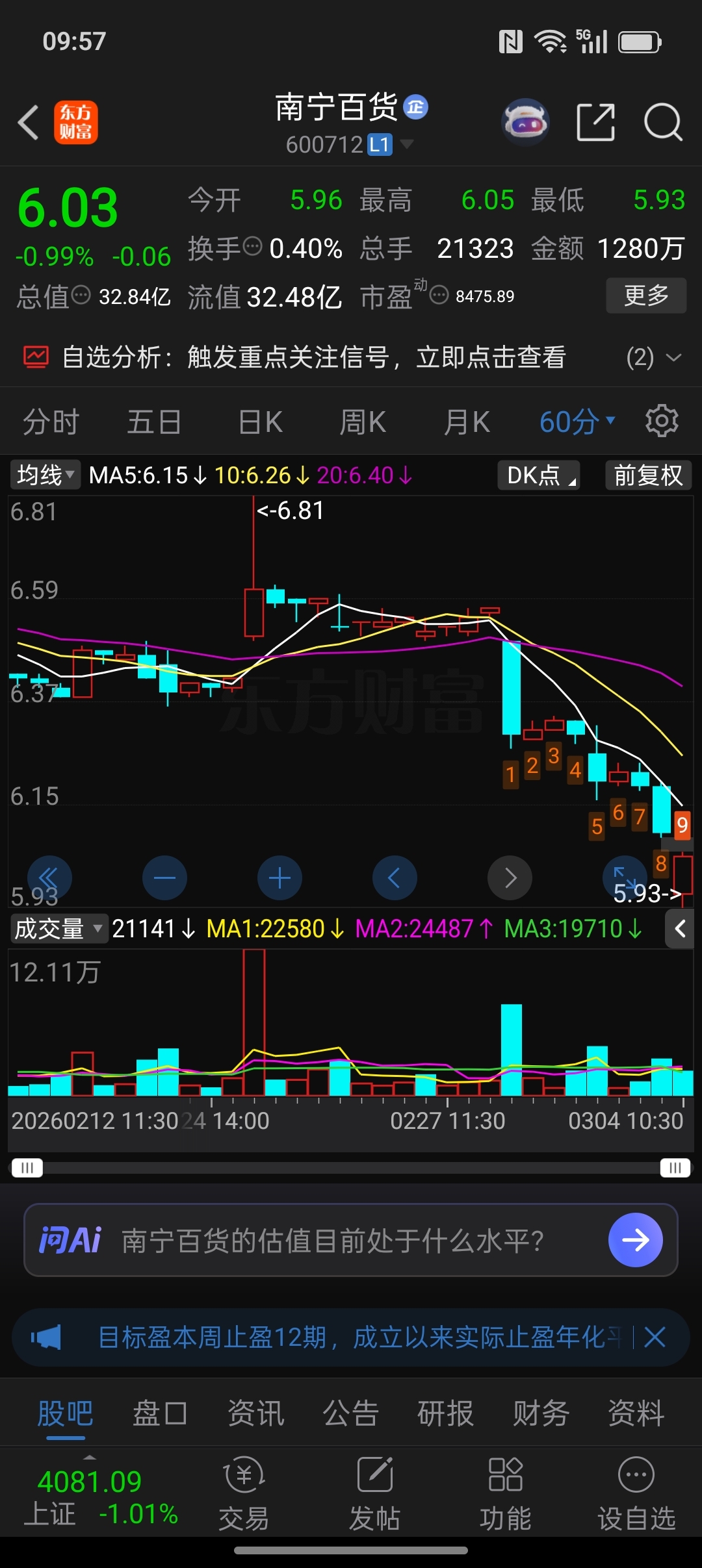 $南宁百货(SH600712)$ 60分钟指标短线见底,但6元附近应该还有反复……
