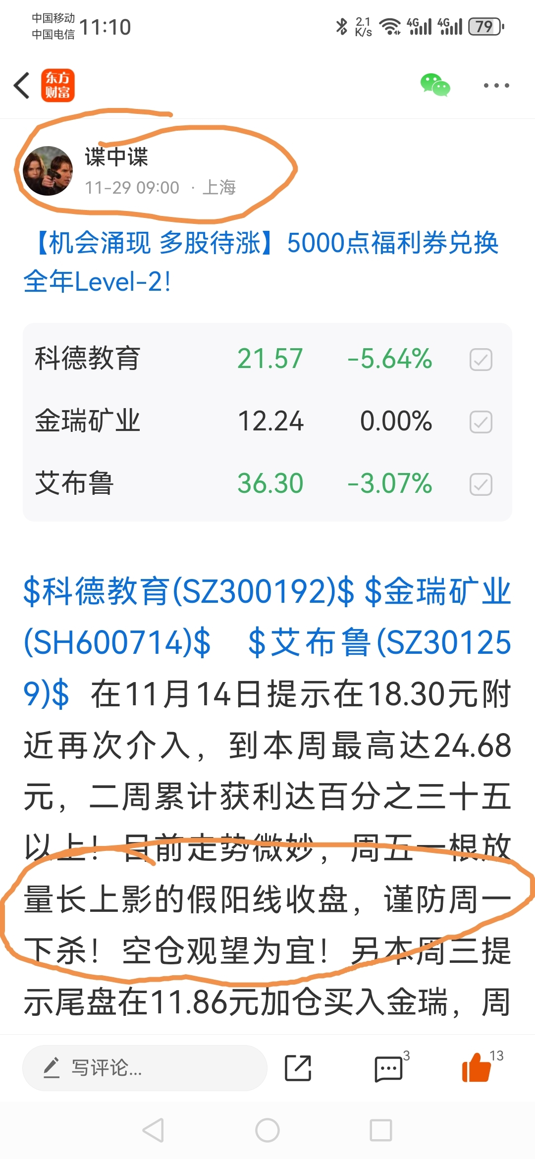$金瑞矿业(SH600714)$ $科德教育(SZ300192)$ $艾布鲁(SZ301259)$ 上周六提示周一小心科德下杀!观望为主,昨尾盘拉高吸引跟风盘,今早直接低开下杀!跌幅达百分之五以上!操作上短线以观望为主!金瑞仍以持有为主,到目标位再考虑抛,如破12元择机低吸加仓!