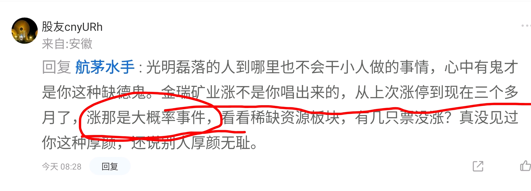 温馨提示: 1.根据《证券法》规定,禁止编造、传播虚假信息或者误导性信息,扰乱证券市场;2.用户在本社区发表的所有资料、言论等仅代表个人观点,与本网站立场无关,不对您构成任何投资建议。用户应基于自己的独立判断,自行决定证券投资并承担相应风险。《东方财富社区管理规定》