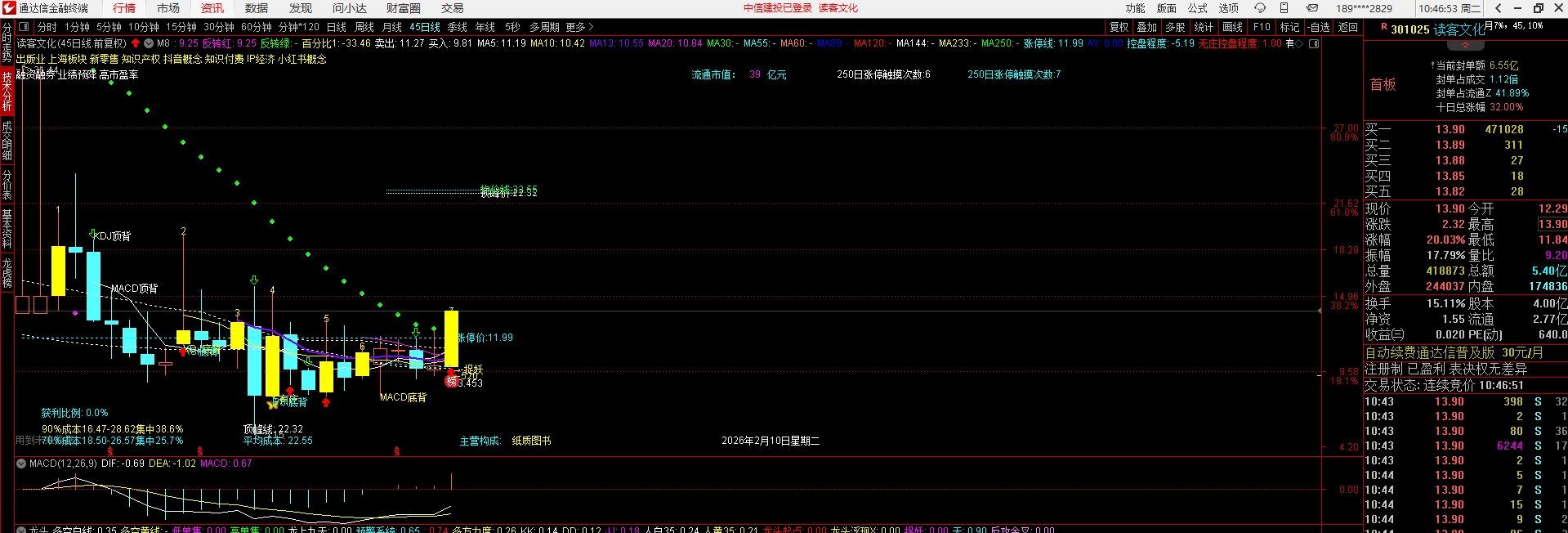 风语筑也是1月29号买的9.34买的,昨天晚上挑选了一个标的,今天也是20厘米涨停,这个标的就是读客文化,读客文化是45日线的反转点,类似于广联航空的走势