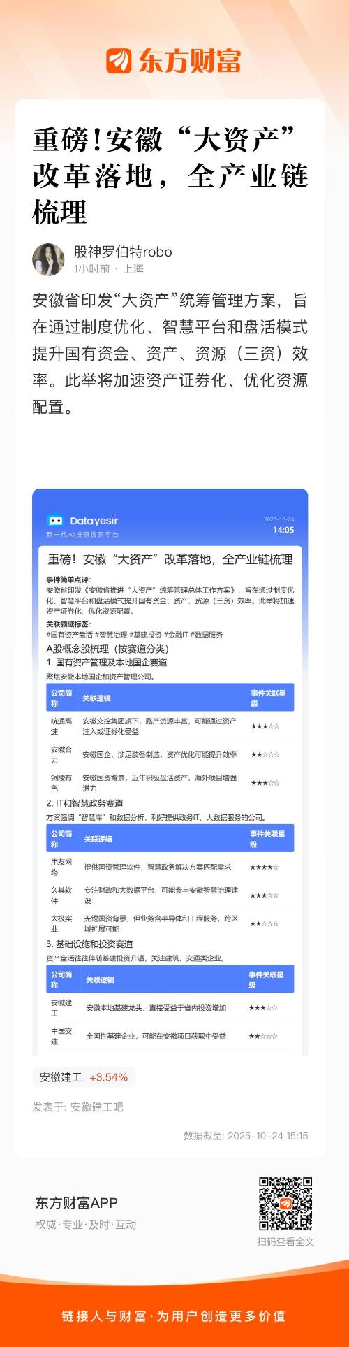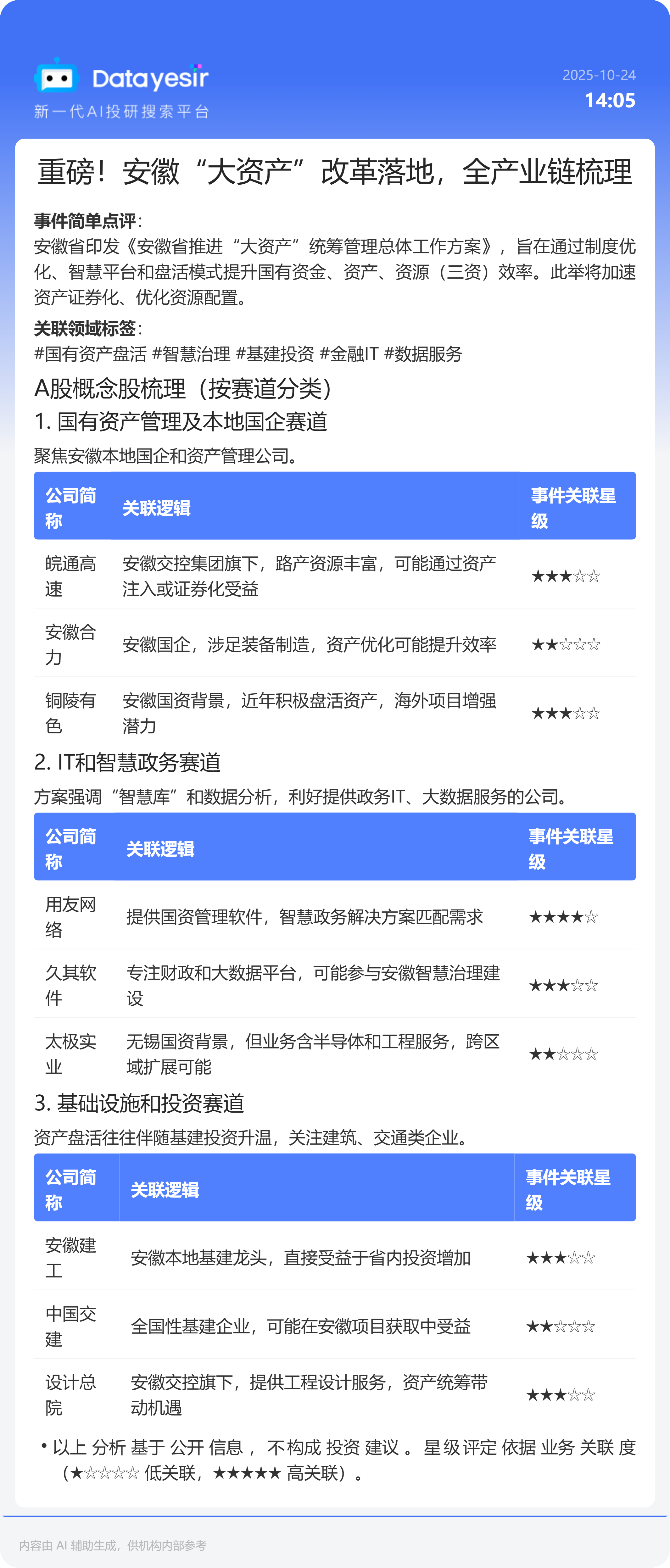 安徽省印发“大资产”统筹管理方案,旨在通过制度优化、智慧平台和盘活模式提升国有资金、资产、资源(三资)效率。此举将加速资产证券化、优化资源配置。