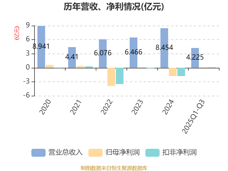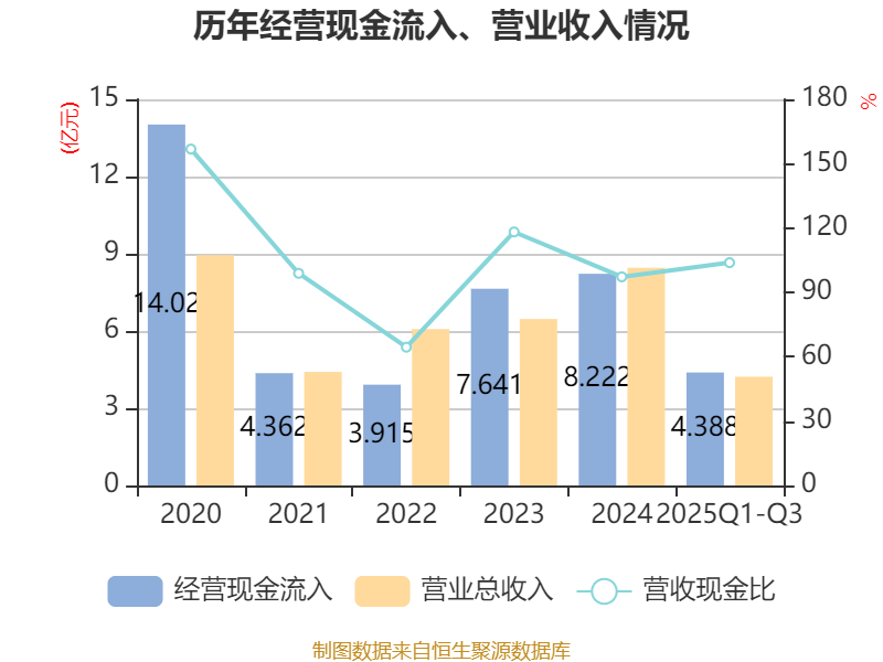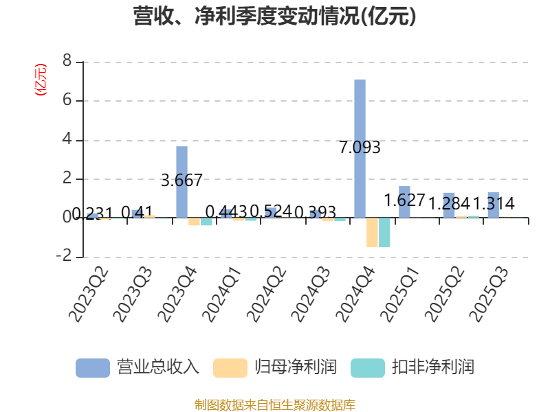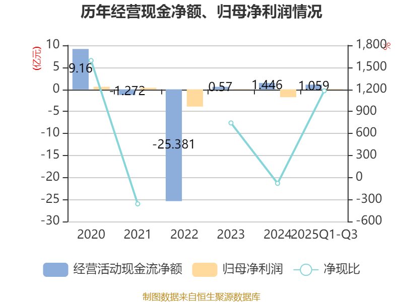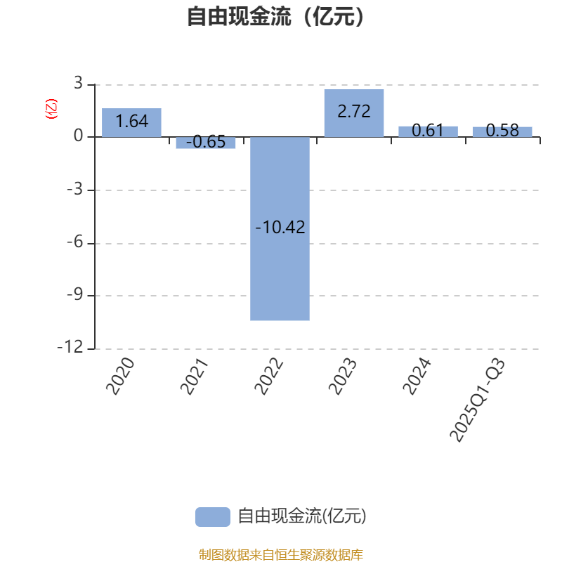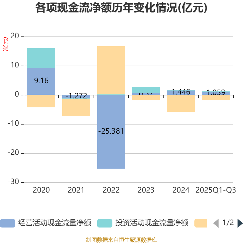 2025年前三季度,公司经营活动现金流净额为1.06亿元,同比增长206.4%;筹资活动现金流净额-1.77亿元,同比增加3.79亿元;投资活动现金流净额2265.49万元,上年同期为1385.89万元。