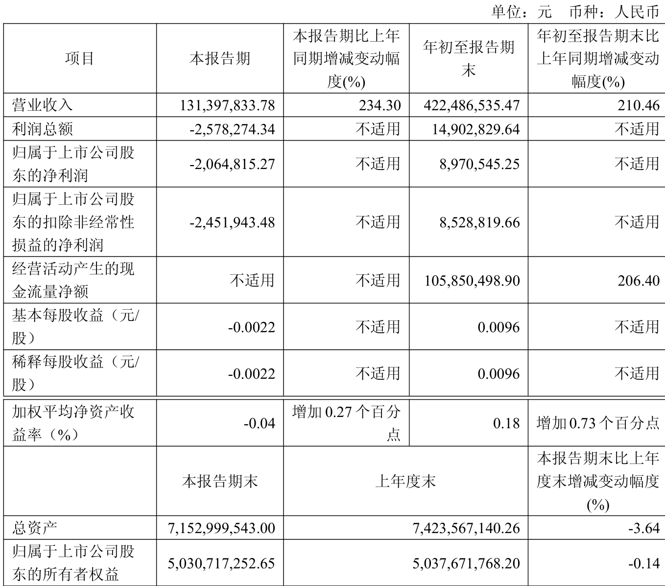 中证智能财讯凤凰股份(600716)10月31日披露2025年第三季度报告。前三季度公司实现营业总收入4.22亿元,同比增长210.46%;归母净利润897.05万元,同比扭亏;扣非净利润852.88万元,同比扭亏;经营活动产生的现金流量净额为1.06亿元,同比增长206.40%;报告期内,凤凰股份基本每股收益为0.0096元,加权平均净资产收益率为0.18%。