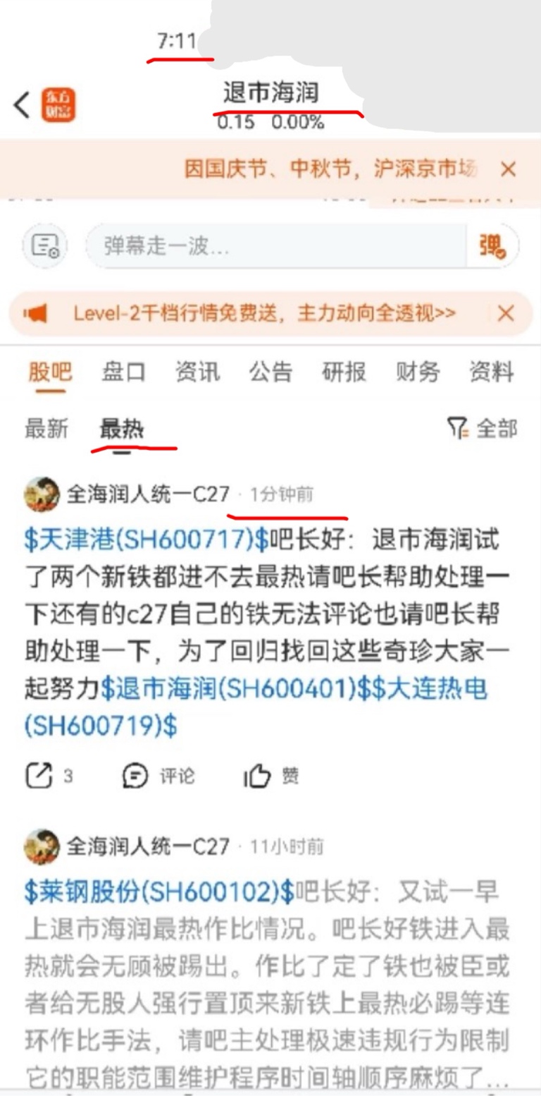 $天津港(SH600717)$ 吧长好:退市海润试了两个新铁都进不去最热,晚上7:11进入最热1分钟,评论一次后过了2分钟7:16被踢出最热,请吧长帮助处理一下,还有的c27自己的铁无法评论发阿都是也请吧长帮助处理一下,为了回归找回这些奇珍大家一起努力$退市海润(SH600401)$ $大连热电(SH600719)$