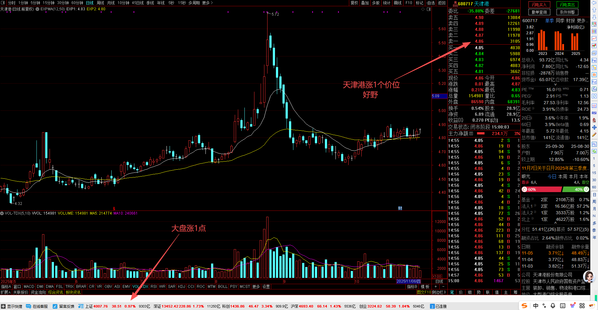 YES,大盘涨1个点,天津港涨1个价位,好野