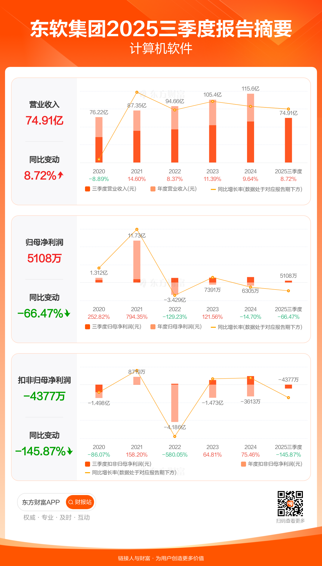 东软集团10月29日发布2025年三季报显示,公司前三季实现营业收入74.91亿元,同比增长8.72%;归母净利润5108.18万元,同比下滑66.47%;扣非归母净利润-4377.08万元。