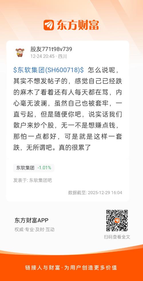 $东软集团(SH600718)$ 怎么说呢,其实不想发帖子的,感觉自己已经跌的麻木了看着还有人每天都在骂,内心毫无波澜,虽然自己也被套牢,一直亏起,但是随便你吧,说实话我们散户来炒个股,无一不是想赚点钱,那怕一点都好,可是就是这样一套跌,无所谓吧。真的很累了
