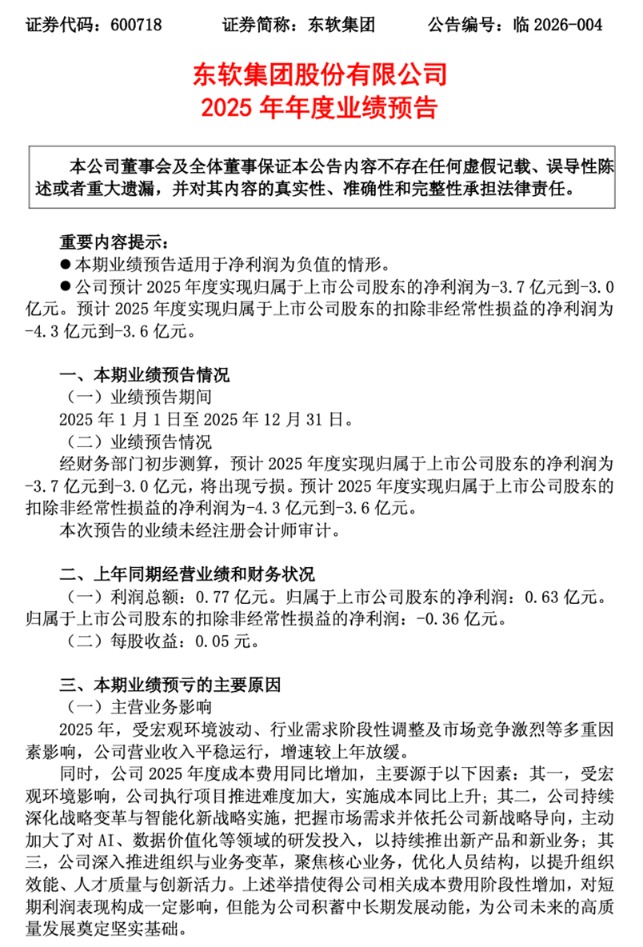2026年1月29日,东软集团发布2025年业绩预告,预计全年归属于上市公司股东的净利润为-3.7亿元到-3.0亿元,这是公司继2024年盈利0.63亿元后再次由盈转亏。