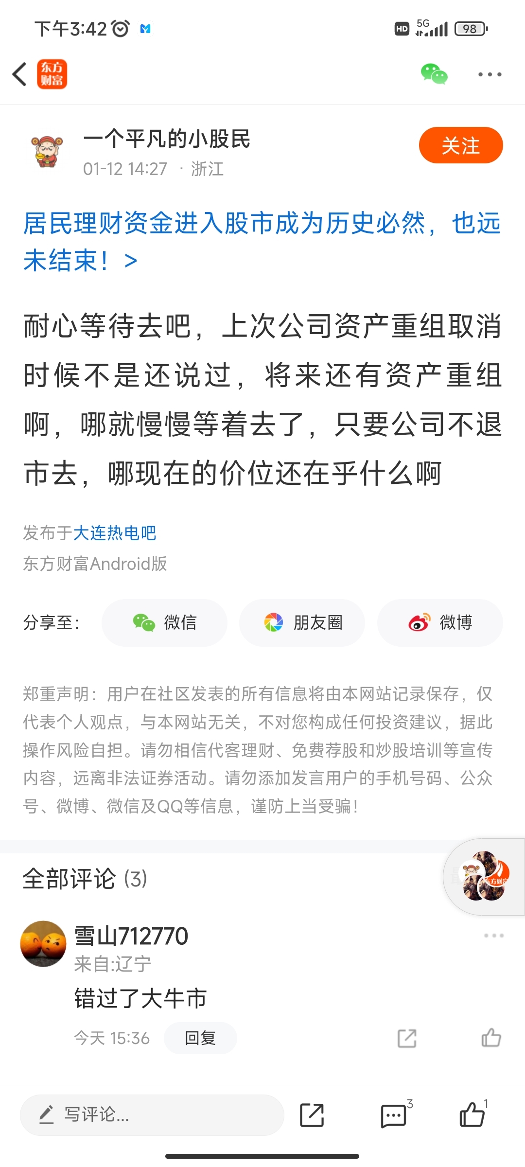 温馨提示: 1.根据《证券法》规定,禁止编造、传播虚假信息或者误导性信息,扰乱证券市场;2.用户在本社区发表的所有资料、言论等仅代表个人观点,与本网站立场无关,不对您构成任何投资建议。用户应基于自己的独立判断,自行决定证券投资并承担相应风险。《东方财富社区管理规定》