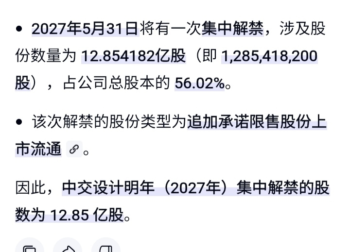 $中交设计(SH600720)$ 小白们明年5月31日集中解禁12.85亿股铁定了!