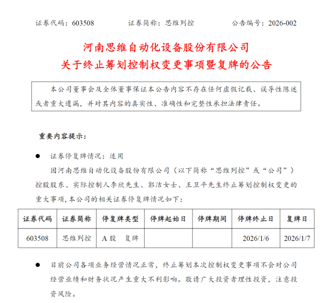 同日,思维列控(603508)公告称,公司控股股东、实际控制人李欣、郭洁、王卫平与交易对方就控制权变更事项进行充分沟通与论证,但双方就部分核心条款未能达成一致意见,决定终止筹划控制权变更事项。各方对终止筹划本次控制权变更事项无需承担违约责任。公司股票自2026年1月7日开市起复牌。目前公司各项业务经营正常,终止筹划事项不会对公司经营业绩和财务状况产生重大不利影响。