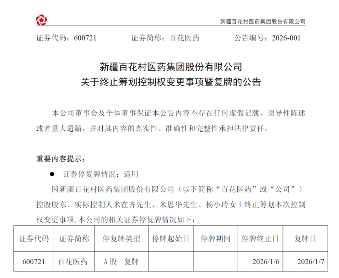 1月6日盘后,百花医药(600721)公告称,因控股股东、实际控制人与交易对方未就控制权变更相关重大事项达成一致意见,决定终止筹划控制权变更事项。公司股票自2026年1月7日起复牌。公司目前各项经营情况正常,终止筹划控制权变更事项不会对公司经营业绩和财务状况产生重大不利影响。