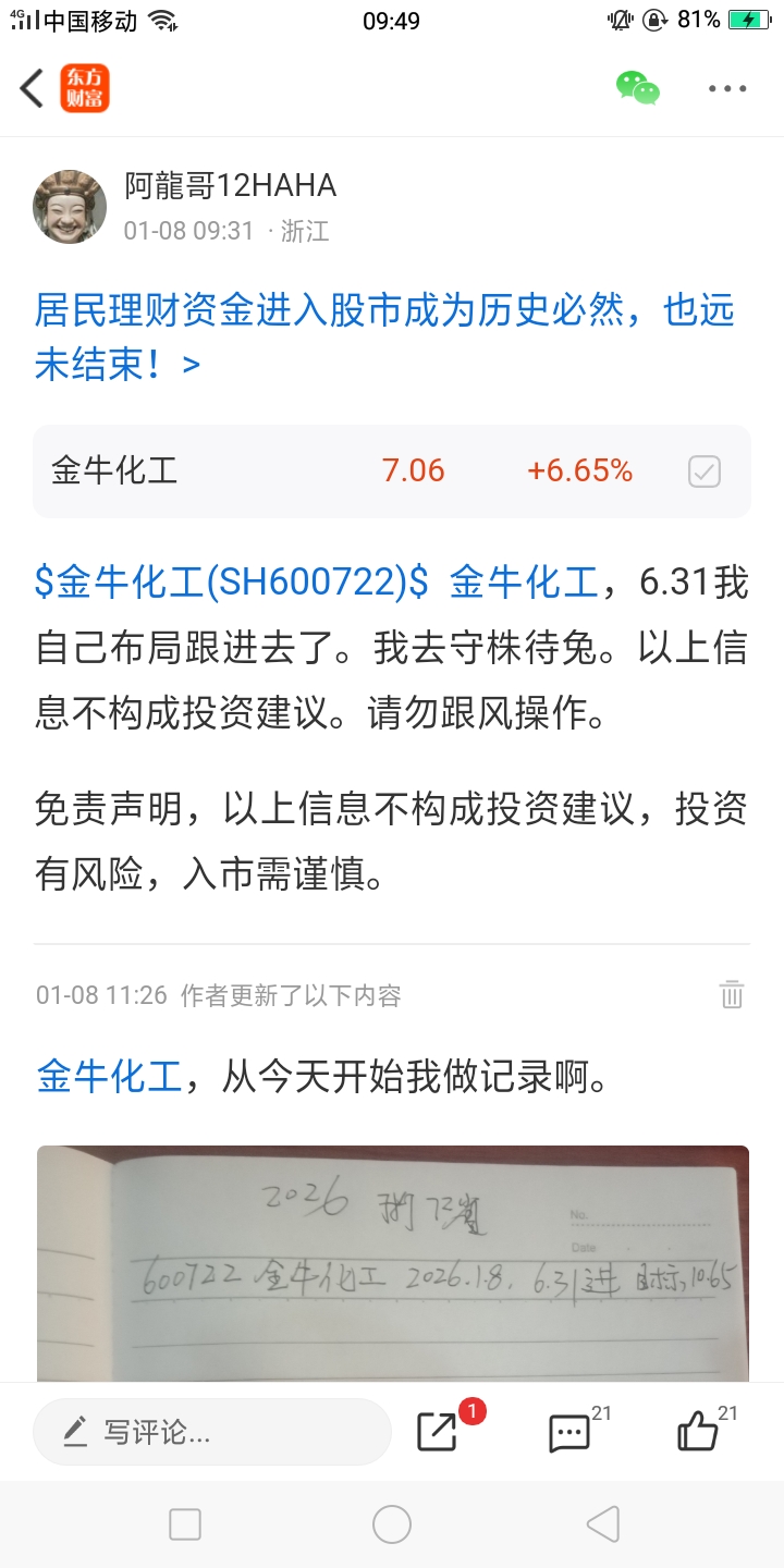 $金牛化工(SH600722)$ 金牛化工,从行情走势看,今天盘面非常强势。有望冲到涨停,昨天我6.66加仓,加仓成功。继续朝着我目标前行。加油!以上信息不构成投资建议,请勿跟风操作,也不要对号入座去操作。