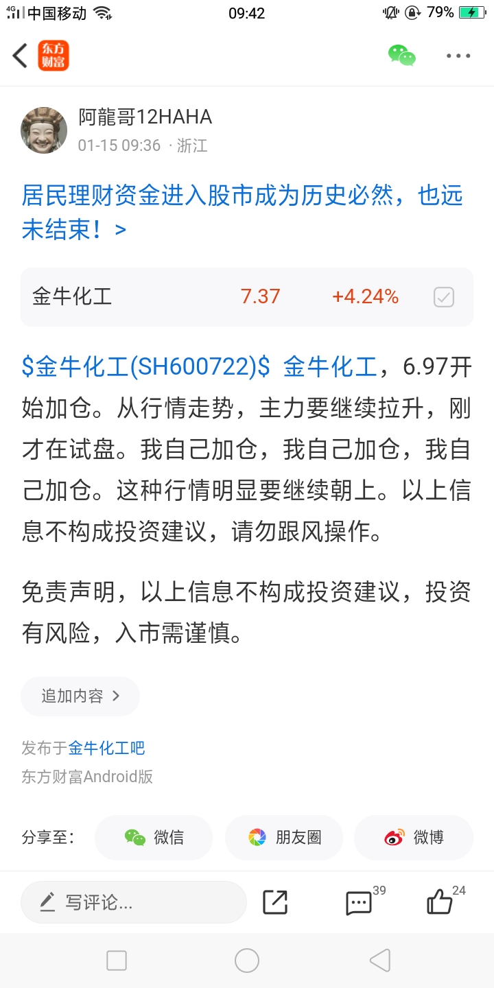 $金牛化工(SH600722)$ 金牛化工,我刚才7.43T出去以前加仓单子。我以前6.97和6.60前几天加过两波仓,我刚才把以前这两波加仓单子T出去了。以上信息不构成投资建议,请勿跟风操作,请勿跟风操作,请勿跟风操作。