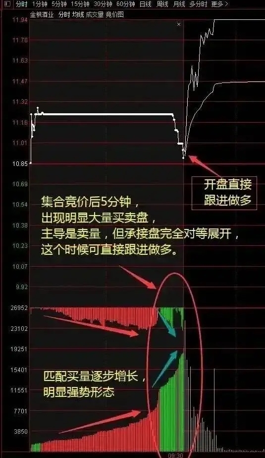 1、集合竞价后5分钟,出现大量的买卖盘,而主导的是卖盘,但承接买盘完全可以对等展开,这个时候入场做多概率高。