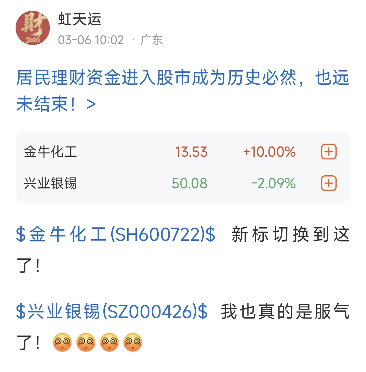 温馨提示: 1.根据《证券法》规定,禁止编造、传播虚假信息或者误导性信息,扰乱证券市场;2.用户在本社区发表的所有资料、言论等仅代表个人观点,与本网站立场无关,不对您构成任何投资建议。用户应基于自己的独立判断,自行决定证券投资并承担相应风险。《东方财富社区管理规定》