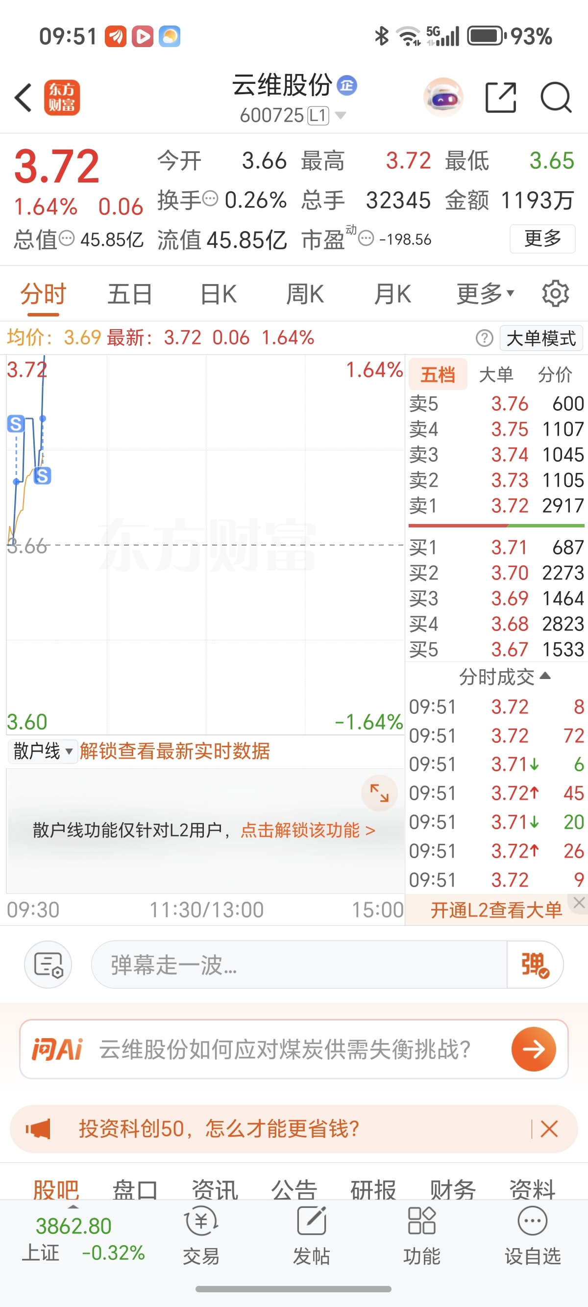 $云维股份(SH600725)$ 开盘挂3.72卖,然后撤了,改为3.68,3.70分别卖10000股