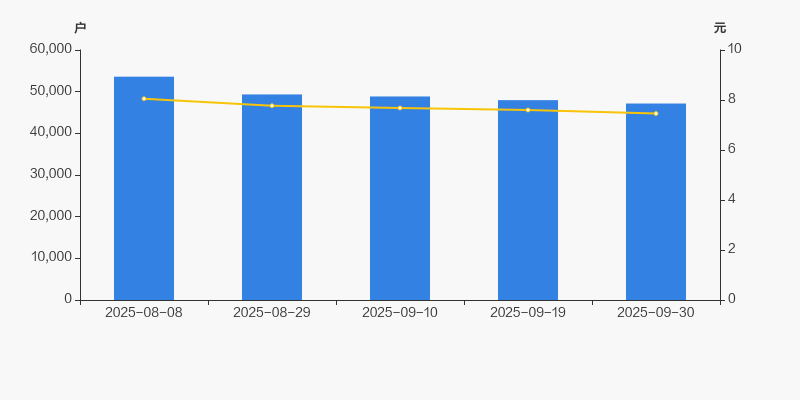 2025年8月8日至今,公司股东户数显著下降,区间跌幅为12.02%。2025年8月8日至2025年9月30日区间股价下降7.33%。