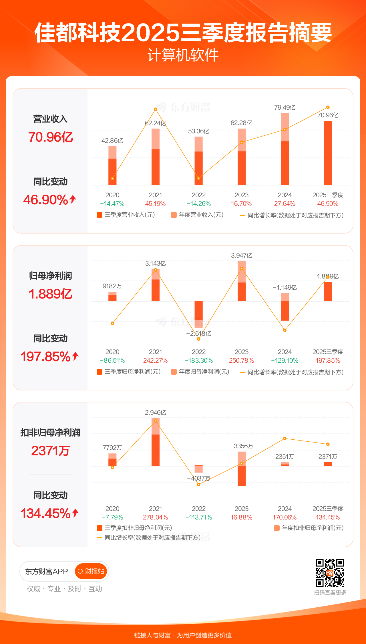 佳都科技10月31日发布2025年三季报显示,公司前三季实现营业收入70.96亿元,同比增长46.90%;归母净利润1.89亿元,同比增长197.85%;扣非归母净利润2371.34万元,同比增长134.45%。