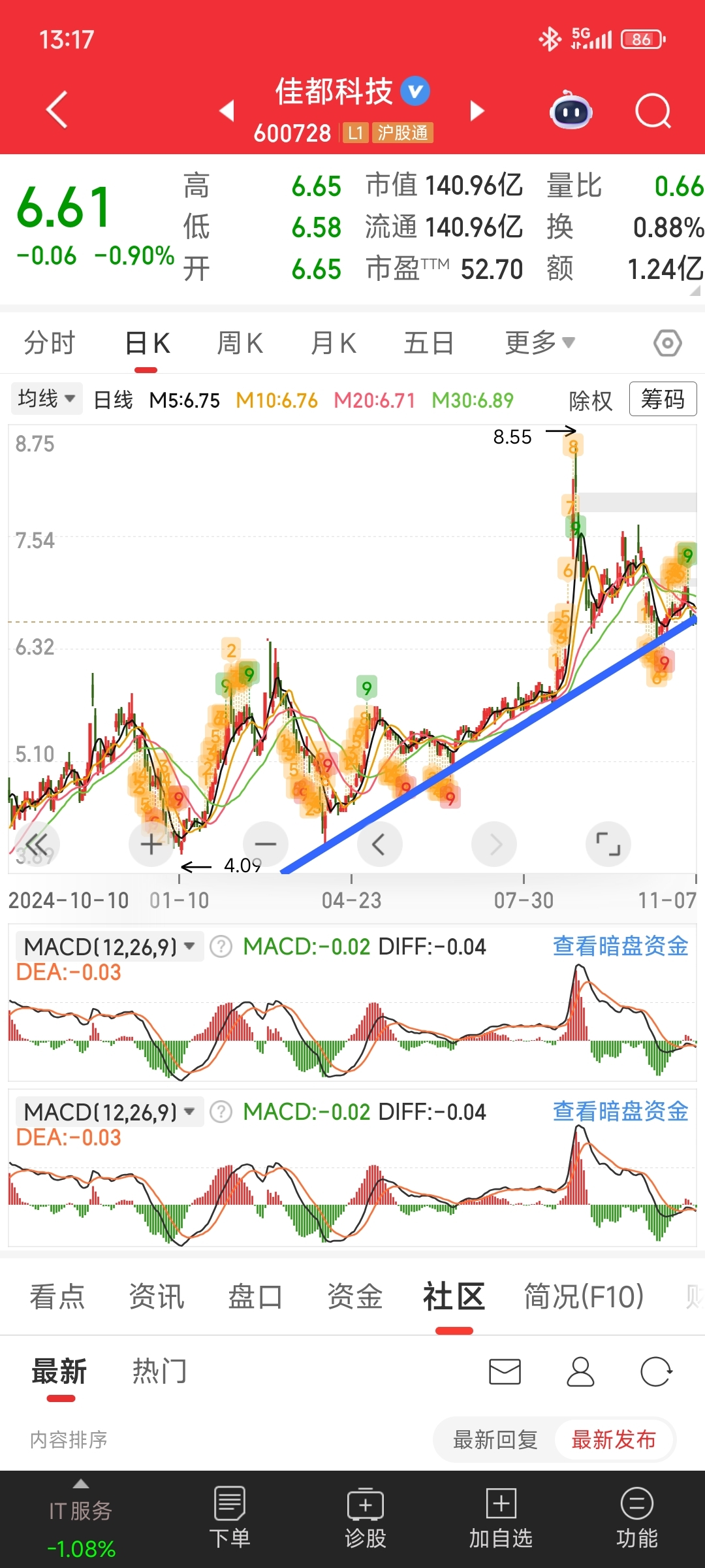 $佳都科技(SH600728)$ 这就是我8月份发的帖子,判断他要上8块的原因。不信的话,可以看我8月20号的帖子。根据波浪理论行情来了,如果后面不能突破前面的855高点,且跌破趋线,要想救回来,几率微乎其微了。况且增加了这么多股东。